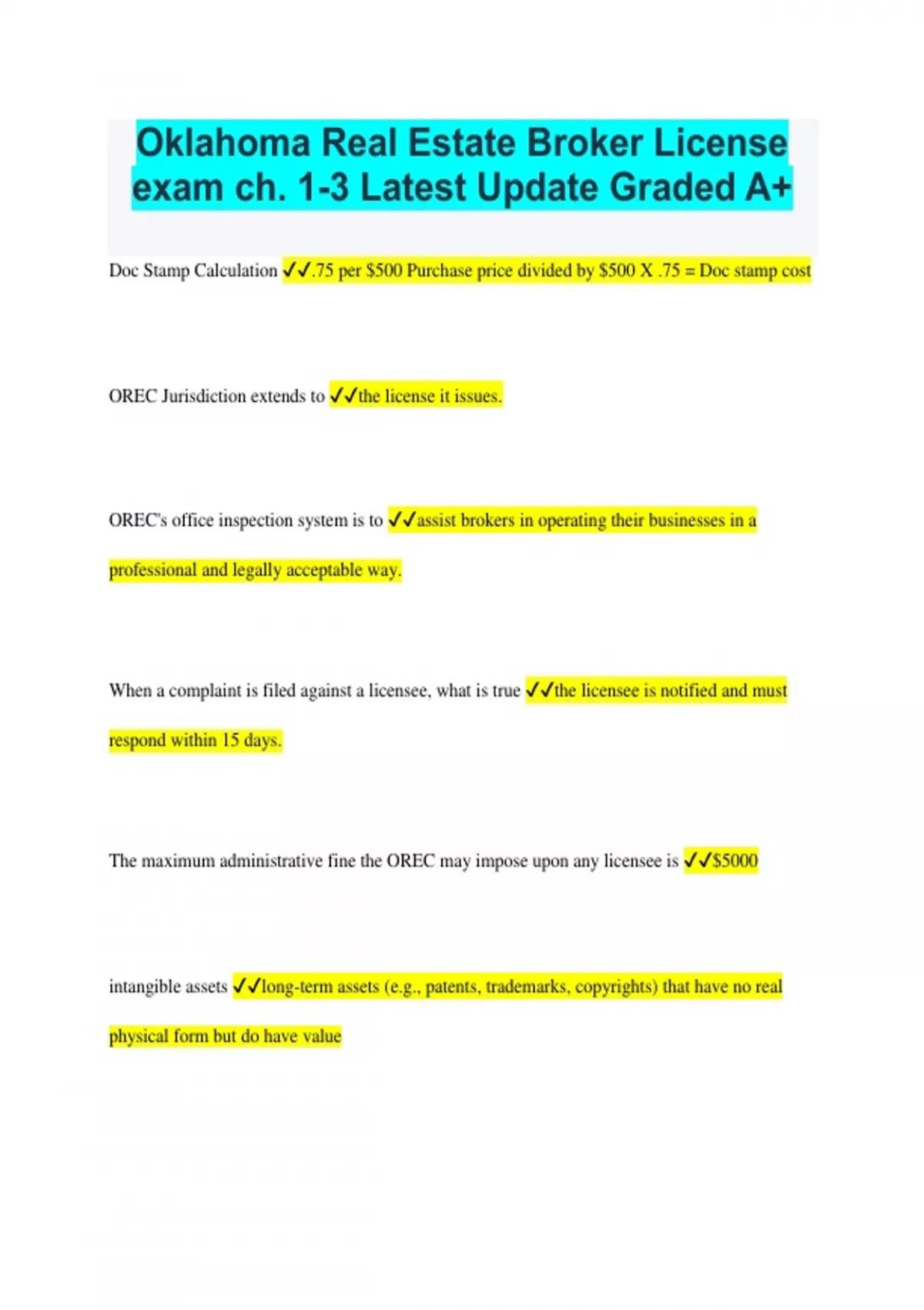 Oklahoma Real Estate Broker License exam ch. 1-3 Latest Update Graded A+