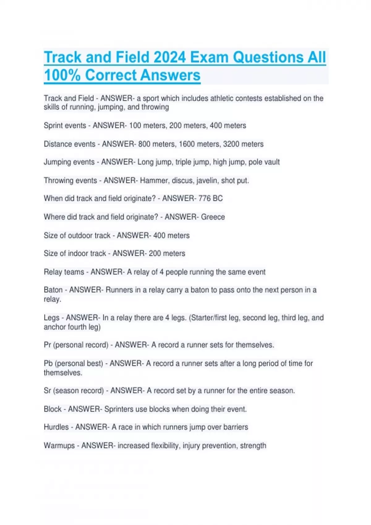 Track and Field 2024 Exam Questions All 100% Correct Answers Track and Field - ANSWER- a sport which includes athletic contests established on the skills of running, jumping, and throwing Sprint events - ANSWER- 100 meters, 200 meters, 400 meters Distance events - ANSWER- 800 meters, 1600 meters, 3200 meters Jumping events - ANSWER- Long jump, triple jump, high jump, pole vault Throwing events - ANSWER- Hammer, discus, javelin, shot put. When did track and field originate? - ANSWER- 776 BC Where did track and field originate? - ANSWER- Greece