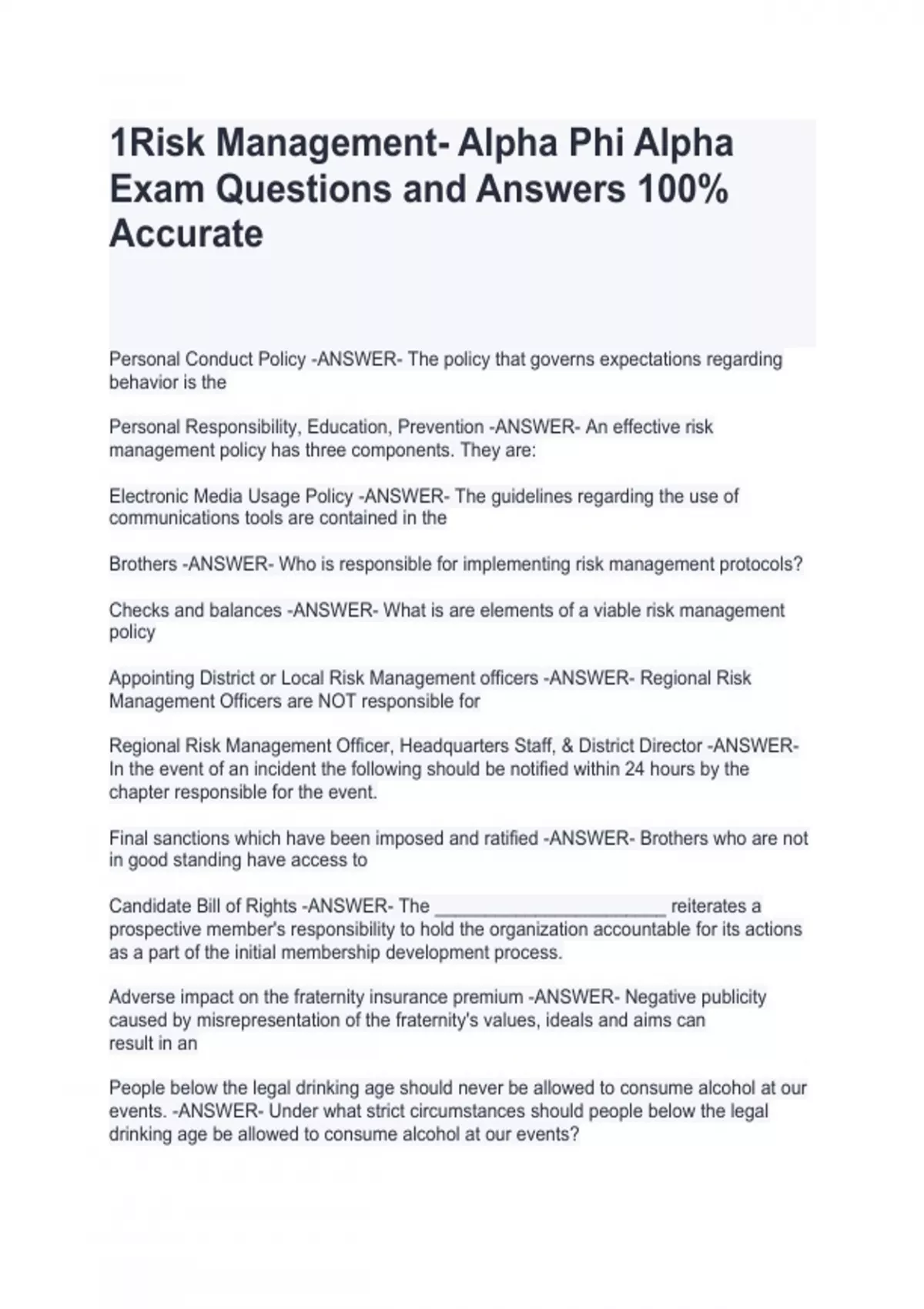1Risk Management- Alpha Phi Alpha Exam Questions and Answers 100% Accuratev