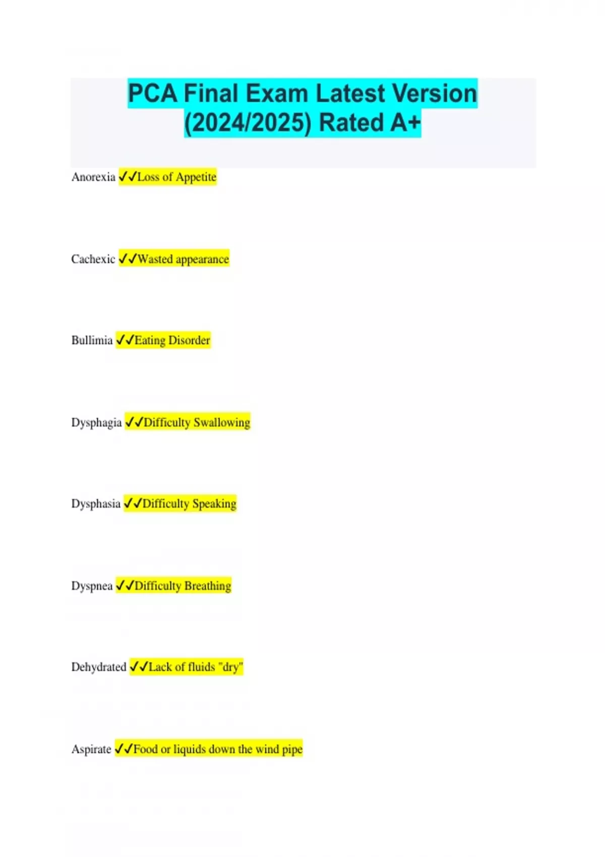 PCA Final Exam Latest Version (2024/2025) Rated A+ Anorexia Loss of Appetite Cachexic Wasted appearance Bullimia Eating Disorder Dysphagia Difficulty Swallowing Dysphasia Difficulty Speaking Dyspnea Difficulty Breathing Dehydrated Lack of fluids "dry" Aspirate Food or liquids down the wind pipe N/G Naso/Gastric TF Tube Feed GT Gastric Tube Peg Long lasting feeding tube GI Gastro/Intestinal Edema Swelling Peristalsis Wave like motion moving through digestive system po by mouth NPO Nothing by mouth I&O Intake and Output cc/ml Cubic centimeter millimeter ADA American Diabetes Association NA Sodium gm gram cal calorie How many cc's in 1 oz 30cc in 1 oz. Volume of Chipped Ice 1/2 of water