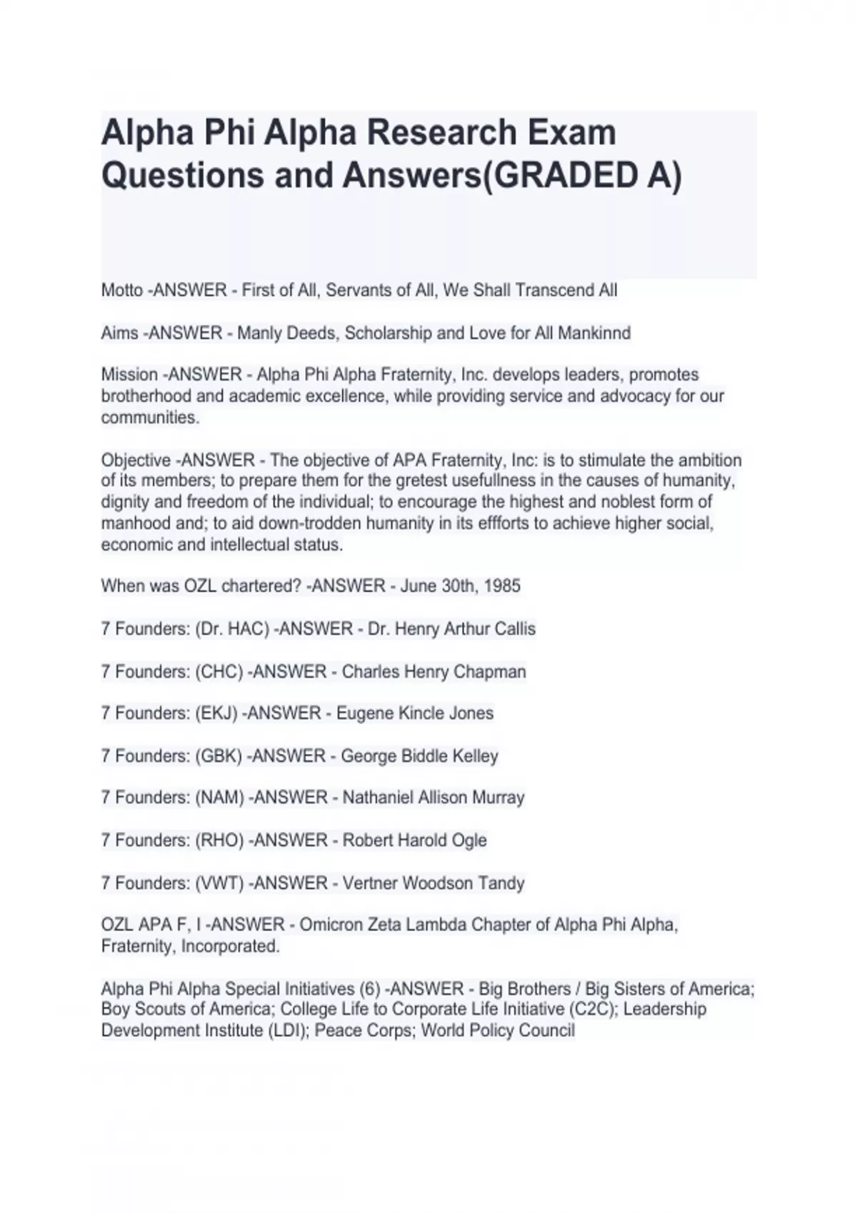 Mission -ANSWER - Alpha Phi Alpha Fraternity, Inc. develops leaders, promotes brotherhood and academic excellence, while providing service and advocacy for our communities. Objective -ANSWER - The objective of APA Fraternity, Inc: is to stimulate the ambition of its members; to prepare them for the gretest usefullness in the causes of humanity, dignity and freedom of the individual; to encourage the highest and noblest form of manhood and; to aid down-trodden humanity in its effforts to achieve higher social, economic and intellectual status. When was OZL chartered? -ANSWER - June 30th, 1985 7 Founders: (Dr. HAC) -ANSWER - Dr. Henry Arthur Callis 7 Founders: (CHC) -ANSWER - Charles Henry Chapman 7 Founders: (EKJ) -ANSWER - Eugene Kincle Jones 7 Founders: (GBK) -ANSWER - George Biddle Kelley 7 Founders: (NAM) -ANSWER - Nathaniel Allison Murray 7 Founders: (RHO) -ANSWER - Robert Harold Ogle 7 Founders: (VWT) -ANSWER - Vertner Woodson Tandy OZL APA F, I -ANSWER - Omicron Zeta Lambda Chapter of Alpha Phi Alpha, Fraternity, Incorporated.