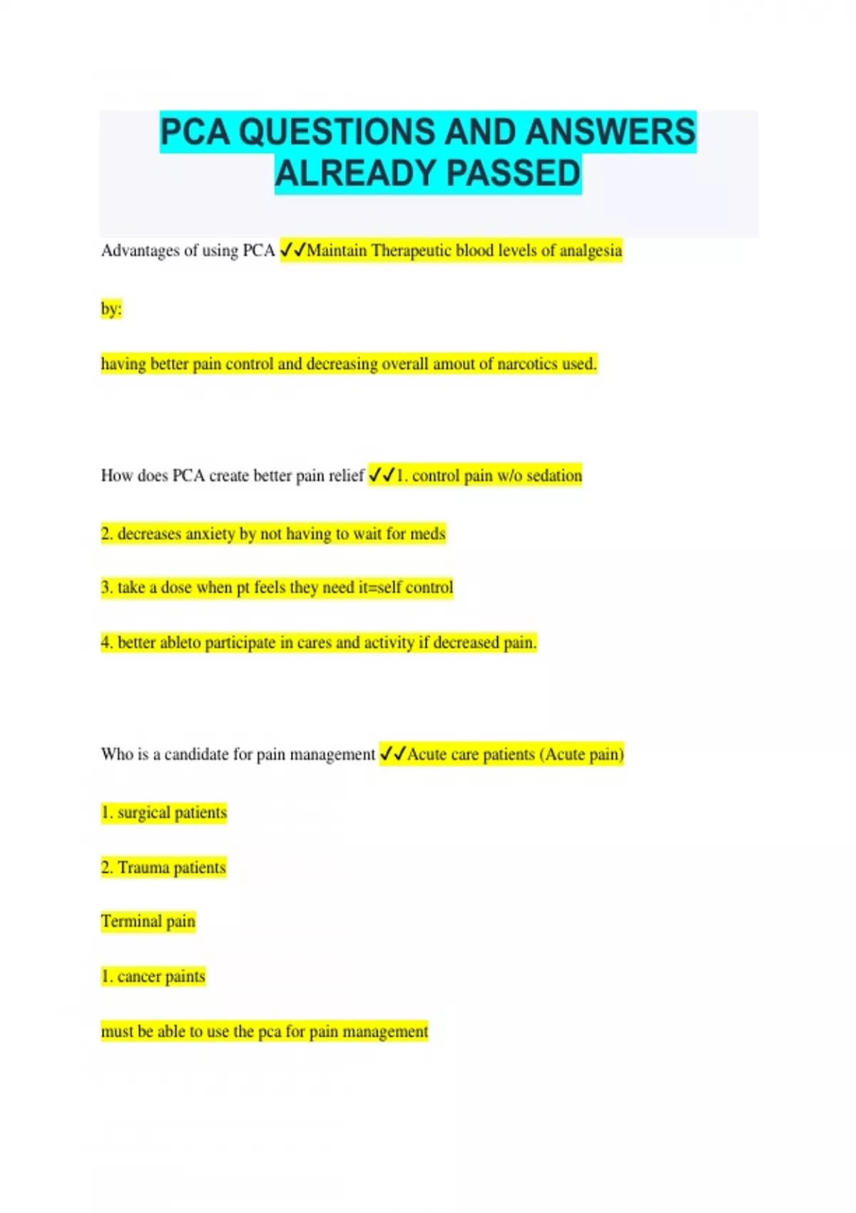PCA QUESTIONS AND ANSWERS ALREADY PASSED Advantages of using PCA Maintain Therapeutic blood levels of analgesia by: having better pain control and decreasing overall amout of narcotics used. How does PCA create better pain relief 1. control pain w/o sedation 2. decreases anxiety by not having to wait for meds 3. take a dose when pt feels they need it=self control 4. better ableto participate in cares and activity if decreased pain. Who is a candidate for pain management Acute care patients (Acute pain) 1. surgical patients 2. Trauma patients Terminal pain 1. cancer paints must be able to use the pca for pain management Criteria for using a PCA for pain management 1. mentally alert (able to understand concept) 2. understand directions for operating the pump 3. ability to press the button Who is not a good candidate for pain management 1. impaired mental status 2. history of COPD (will cause respiratory depression by inc. co2 in lungs from dec. RR) 3. impaired renal or hepatic function (may require 25-50% less narcotics due to inability to excrete them from the blood) 4. inability to press the button 5. history of addiction 6. minimum age of 18 in most cases (per policy) PCA pump orders vs. delivery system Delivers in ml/hour, ordered in mg/hour or mcg/hour Causes risk for ERROR Types of dosing continuous infusion =Basal rate demand dosing (pt dose) bolus dose (loading) 4 hour limit Basal rate PCA pump administers small dose of analgesic every hour Basal Rate advantage more consistent dosing pt can fall asleep without fear or not getting medication Disadvantage of Basal Rate IF set at wrong rate pt can get too high of a dose which could cause respiratory depression increased sedation