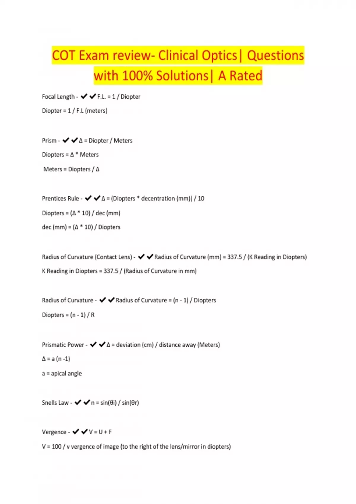 COT Exam review- Clinical Optics| Questions with 100% Solutions| A Rated