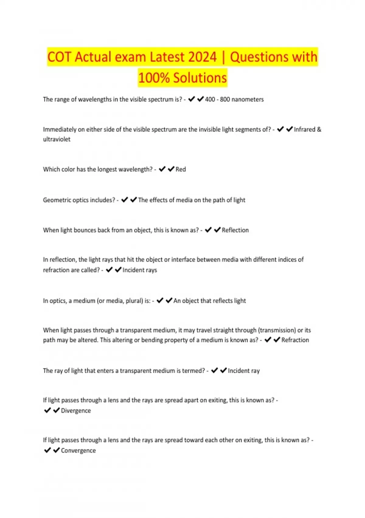cot actual exam latest 2024
