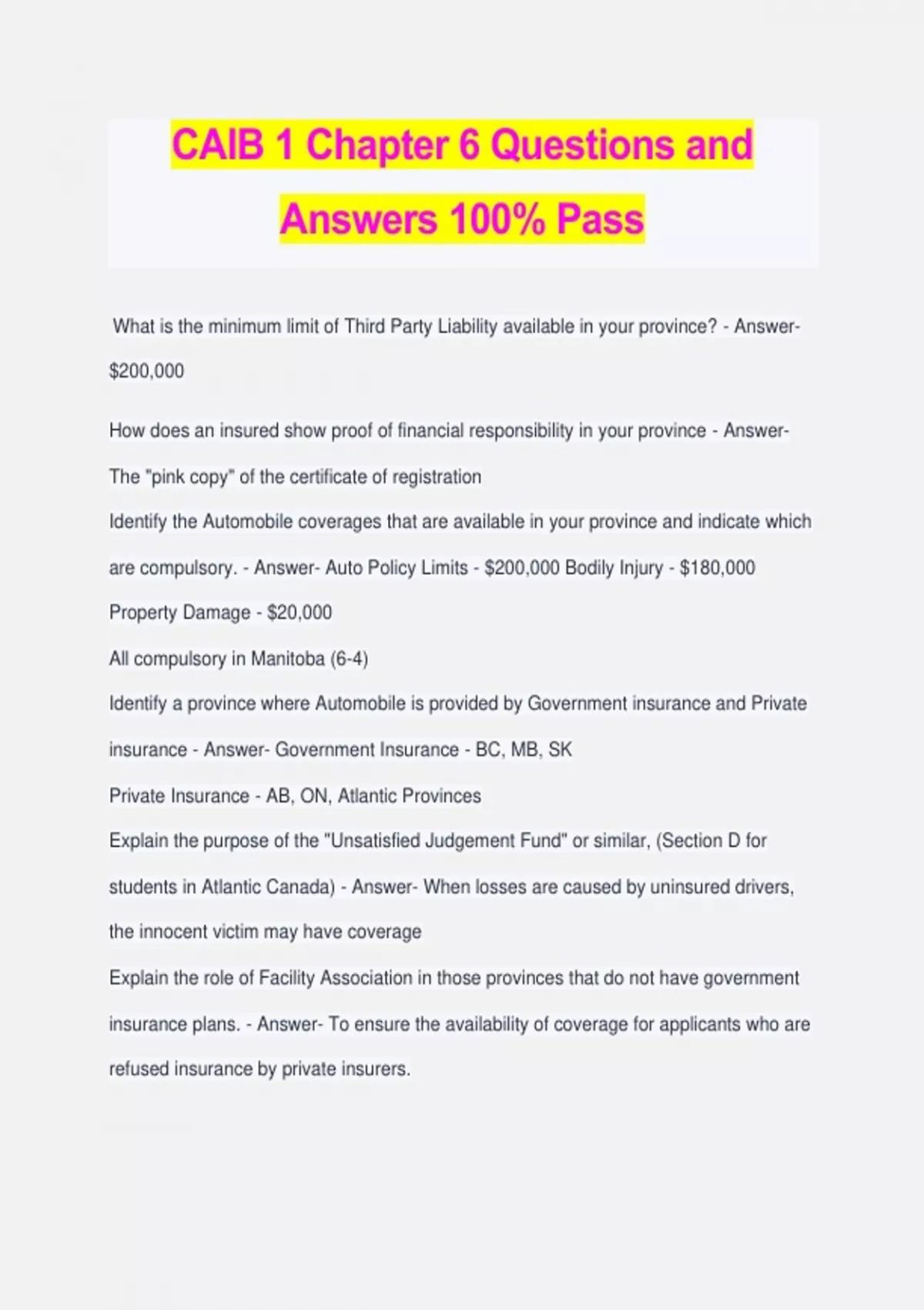 CAIB 1 Chapter 6 Questions and Answers 100% Pass What is the minimum limit of Third Party Liability available in your province? - Answer- $200,000 How does an insured show proof of financial responsibility in your province - Answer- The "pink copy" of the certificate of registration Identify the Automobile coverages that are available in your province and indicate which are compulsory. - Answer- Auto Policy Limits - $200,000 Bodily Injury - $180,000 Property Damage - $20,000 All compulsory in Manitoba (6-4) Identify a province where Automobile is provided by Government insurance and Private insurance - Answer- Government Insurance - BC, MB, SK Private Insurance - AB, ON, Atlantic Provinces Explain the purpose of the "Unsatisfied Judgement Fund" or similar, (Section D for students in Atlantic Canada) - Answer- When losses are caused by uninsured drivers, the innocent victim may have coverage Explain the role of Facility Association in those provinces that do not have government insurance plans. - Answer- To ensure the availability of coverage for applicants who are refused insurance by private insurers. Briefly outline the operation of any "no fault" insurance plan of the province of your choice. - Answer- Their primary purpose is to provide benefits to persons injured in automobile accidents, regardless of who is at fault. Explain why the SAF No. 1 requires the applicant's full name and postal address including the country or district. - Answer- Reduces the potential for error that might occur if only the name is known. Could be multiple people same name Identify 5 particulars of the "Described Automobile" required to be included in the application - Answer- 1. Model Year