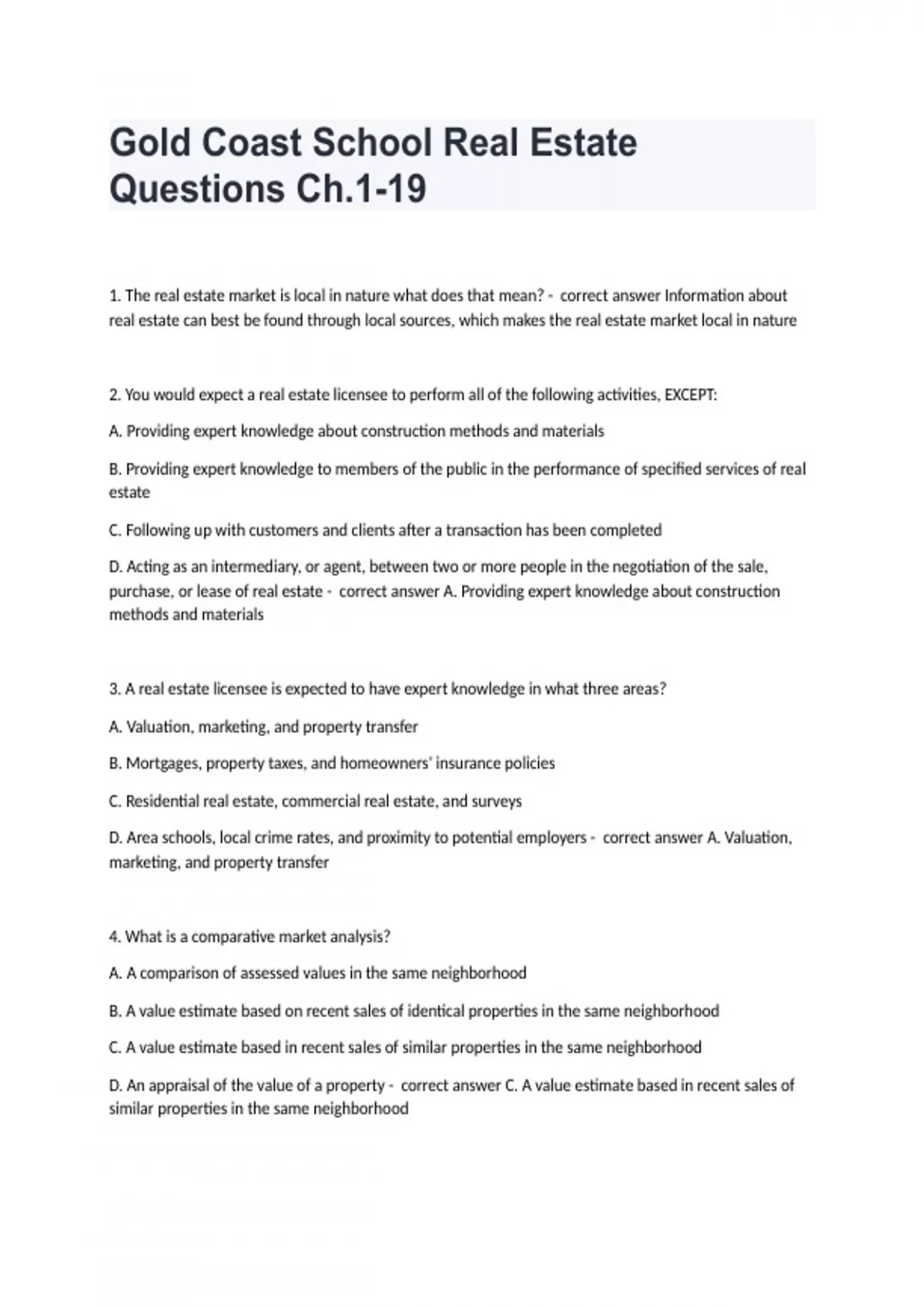 Gold Coast School Real Estate Questions Ch.1-191. The real estate market is local in nature what does that mean? - correct answer Information about real estate can best be found through local sources, which makes the real estate market local in nature 2. You would expect a real estate licensee to perform all of the following activities, EXCEPT: A. Providing expert knowledge about construction methods and materials B. Providing expert knowledge to members of the public in the performance of specified services of real estate C. Following up with customers and clients after a transaction has been completed D. Acting as an intermediary, or agent, between two or more people in the negotiation of the sale, purchase, or lease of real estate - correct answer A. Providing expert knowledge about construction methods and materials 3. A real estate licensee is expected to have expert knowledge in what three areas? A. Valuation, marketing, and property transfer B. Mortgages, property taxes, and homeowners' insurance policies C. Residential real estate, commercial real estate, and surveys D. Area schools, local crime rates, and proximity to potential employers - correct answer A. Valuation, marketing, and property transfer 4. What is a comparative market analysis? A. A comparison of assessed values in the same neighborhood B. A value estimate based on recent sales of identical properties in the same neighborhood C. A value estimate based in recent sales of similar properties in the same neighborhood D. An appraisal of the value of a property - correct answer C. A value estimate based in recent sales of similar properties in the same neighborhood 5. Which type of valuation must be performed in accordance with the Uniform Standards of Professional Appraisal Practice (USPAP) A. Appraisal in a federally-related transaction B. Broker price opinion (BPO) C. Comparative market analysis (CMA) D. None of the above - correct answer A. Appraisal in a federally-related transaction 6. Many real estate licensees engage in "farming". Which of the following best describes what that means? A. They conduct open houses on weekends B. They use marketing vehicles such as direct mailing and advertisements in real estate magazines C. They concentrate on the sale of agricultural properties D. They concentrate on one type of property or in a particular neighborhood - correct answer D. They concentrate on one type of property or in a particular neighborhood All of the following would be considered commercial property, EXCEPT A. an office building that accommodates three tenants B. A high-rise apartment building in the downtown area of the city C. A shopping center that adjoins a residential neighborhood D. A large house that has been subdivided into four apartments - correct answer D. A large house that has been subdivided into four apartments If the sale of a business involves the transfer of ownership of shares of stock, what additional requirement is imposed? A. The real estate licensee must be associated with a brokerage firm B. A brokerage firm must be brought in to handle the transaction C. The real estate licensee must have a securities license D. The real estate licensee must have experience as a stockbroker - correct answer C. The real estate licensee must have a securities license