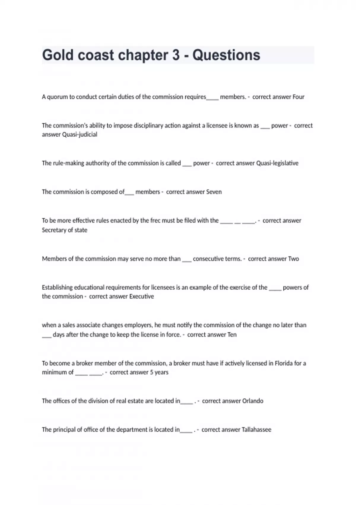 Gold coast chapter 3 - QuestionsA quorum to conduct certain duties of the commission requires____ members. - correct answer Four The commission's ability to impose disciplinary action against a licensee is known as ___ power - correct answer Quasi-judicial The rule-making authority of the commission is called ___ power - correct answer Quasi-legislative The commission is composed of___ members - correct answer Seven To be more effective rules enacted by the frec must be filed with the ____ __ ____. - correct answer Secretary of state Members of the commission may serve no more than ___ consecutive terms. - correct answer Two Establishing educational requirements for licensees is an example of the exercise of the ____ powers of the commission - correct answer Executive when a sales associate changes employers, he must notify the commission of the change no later than ___ days after the change to keep the license in force. - correct answer Ten To become a broker member of the commission, a broker must have if actively licensed in Florida for a minimum of ____ ____. - correct answer 5 years The offices of the division of real estate are located in____ . - correct answer Orlando The principal of office of the department is located in____ . - correct answer Tallahassee
