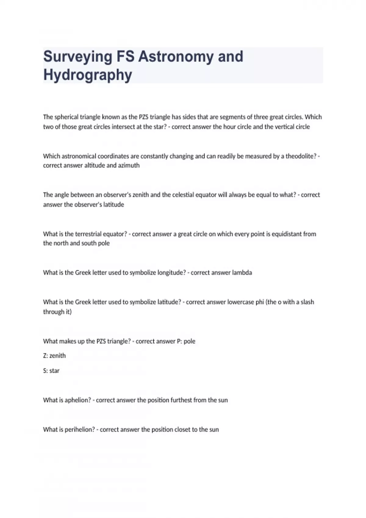 Surveying FS Astronomy and HydrographyThe spherical triangle known as the PZS triangle has sides that are segments of three great circles. Which two of those great circles intersect at the star? - correct answer the hour circle and the vertical circle Which astronomical coordinates are constantly changing and can readily be measured by a theodolite? - correct answer altitude and azimuth The angle between an observer's zenith and the celestial equator will always be equal to what? - correct answer the observer's latitude What is the terrestrial equator? - correct answer a great circle on which every point is equidistant from the north and south pole What is the Greek letter used to symbolize longitude? - correct answer lambda What is the Greek letter used to symbolize latitude? - correct answer lowercase phi (the o with a slash through it) What makes up the PZS triangle? - correct answer P: pole Z: zenith S: star What is aphelion? - correct answer the position furthest from the sun What is perihelion? - correct answer the position closet to the sun