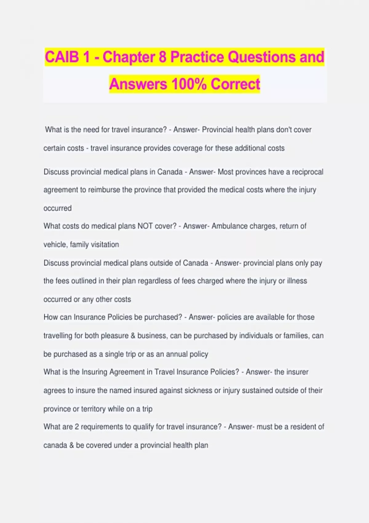 CAIB 1 - Chapter 8 Practice Questions and Answers 100% Correct What is the need for travel insurance? - Answer- Provincial health plans don't cover certain costs - travel insurance provides coverage for these additional costs Discuss provincial medical plans in Canada - Answer- Most provinces have a reciprocal agreement to reimburse the province that provided the medical costs where the injury occurred What costs do medical plans NOT cover? - Answer- Ambulance charges, return of vehicle, family visitation Discuss provincial medical plans outside of Canada - Answer- provincial plans only pay the fees outlined in their plan regardless of fees charged where the injury or illness occurred or any other costs How can Insurance Policies be purchased? - Answer- policies are available for those travelling for both pleasure & business, can be purchased by individuals or families, can be purchased as a single trip or as an annual policy What is the Insuring Agreement in Travel Insurance Policies? - Answer- the insurer agrees to insure the named insured against sickness or injury sustained outside of their province or territory while on a trip What are 2 requirements to qualify for travel insurance? - Answer- must be a resident of canada & be covered under a provincial health plan When does insurance commence? - Answer- when the insured leaves their province following the application date and effective date When does insurance expire for Single Trips & Multi Trips - Answer- Single Trip: the return date on the policy. Multi Trip: the date the insured returns or 30 days after departure Define Insured - Answer- the applicant for insurance, their spouse and dependant children
