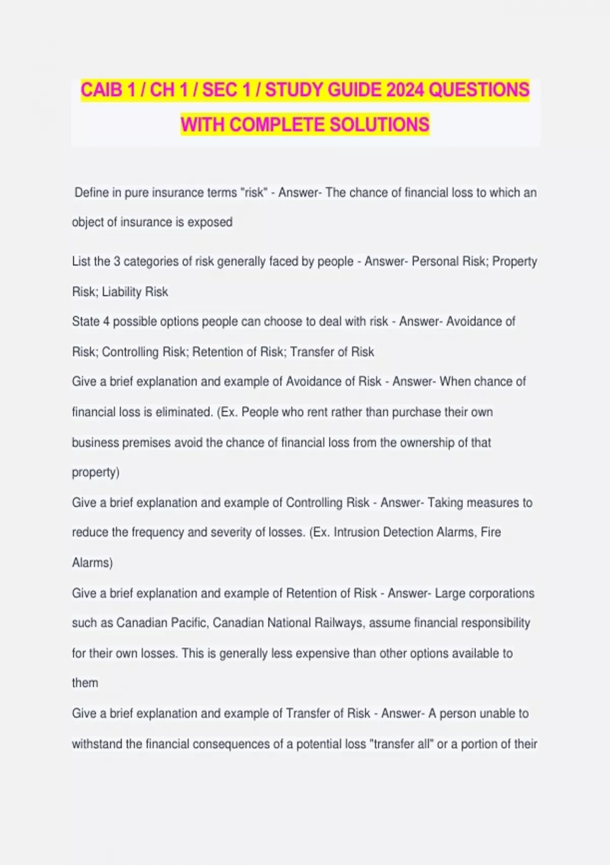 CAIB 1 / CH 1 / SEC 1 / STUDY GUIDE 2024 QUESTIONS WITH COMPLETE SOLUTIONS Define in pure insurance terms "risk" - Answer- The chance of financial loss to which an object of insurance is exposed List the 3 categories of risk generally faced by people - Answer- Personal Risk; Property Risk; Liability Risk State 4 possible options people can choose to deal with risk - Answer- Avoidance of Risk; Controlling Risk; Retention of Risk; Transfer of Risk Give a brief explanation and example of Avoidance of Risk - Answer- When chance of financial loss is eliminated. (Ex. People who rent rather than purchase their own business premises avoid the chance of financial loss from the ownership of that property) Give a brief explanation and example of Controlling Risk - Answer- Taking measures to reduce the frequency and severity of losses. (Ex. Intrusion Detection Alarms, Fire Alarms) Give a brief explanation and example of Retention of Risk - Answer- Large corporations such as Canadian Pacific, Canadian National Railways, assume financial responsibility for their own losses. This is generally less expensive than other options available to them Give a brief explanation and example of Transfer of Risk - Answer- A person unable to withstand the financial consequences of a potential loss "transfer all" or a portion of their risk. Insurance companies usually agree to assume the financial responsibility of persons for their losses Give 2 examples of loss control measures that can be taken to reduce frequency and severity of losses - Answer- Intrusion Detection Alarms; Fire Detection Alarms State 2 reasons why loss control measures are not a total solution in eliminating financial loss - Answer- Equipment may not work 100% of the time; losses such as wind, hail and lightning cannot be controlled Which of the 4 possible options is generally not an effective means of dealing with risk - Answer- Avoidance of Risk. In most cases, exposure to financial loss is simply replaced with another Which of the 4 possible options is the most popular and practical means of dealing with risk - Answer- Transfer of Risk Explain, using an example, "speculative risk" - Answer- The chance of financial loss or gain (placing a bet at a Black Jack table) Explain, using an example, "pure risk" - Answer- The chance of financial loss with no chance of financial gain (hail damage to your roof) Which type of risk will insurers not provide an insurance policy for - Answer- Speculative Risk