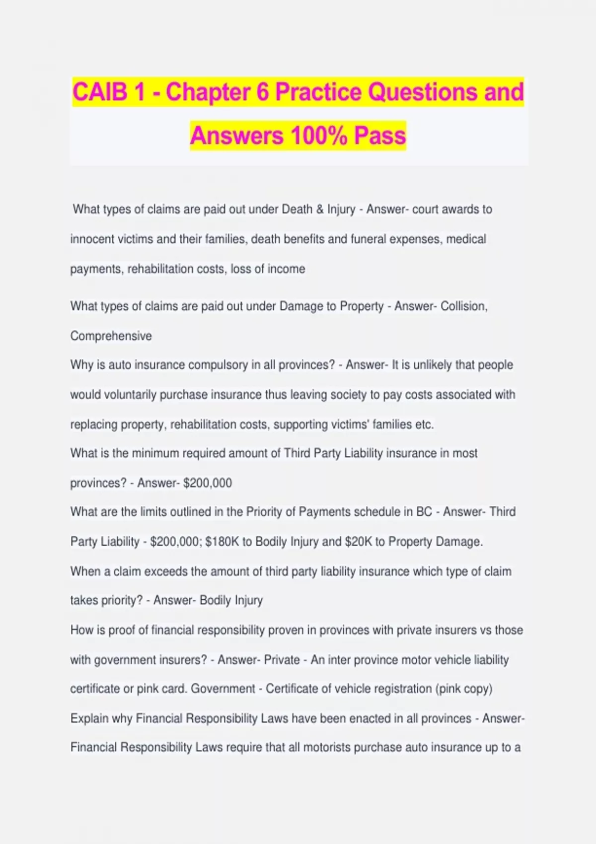CAIB 1 - Chapter 6 Practice Questions and Answers 100% Pass What types of claims are paid out under Death & Injury - Answer- court awards to innocent victims and their families, death benefits and funeral expenses, medical payments, rehabilitation costs, loss of income What types of claims are paid out under Damage to Property - Answer- Collision, Comprehensive Why is auto insurance compulsory in all provinces? - Answer- It is unlikely that people would voluntarily purchase insurance thus leaving society to pay costs associated with replacing property, rehabilitation costs, supporting victims' families etc. What is the minimum required amount of Third Party Liability insurance in most provinces? - Answer- $200,000 What are the limits outlined in the Priority of Payments schedule in BC - Answer- Third Party Liability - $200,000; $180K to Bodily Injury and $20K to Property Damage. When a claim exceeds the amount of third party liability insurance which type of claim takes priority? - Answer- Bodily Injury How is proof of financial responsibility proven in provinces with private insurers vs those with government insurers? - Answer- Private - An inter province motor vehicle liability certificate or pink card. Government - Certificate of vehicle registration (pink copy) Explain why Financial Responsibility Laws have been enacted in all provinces - Answer- Financial Responsibility Laws require that all motorists purchase auto insurance up to a certain dollar amount - this helps to ensure that society is not left to pay the costs of restoring property damage, rehabilitating accident victims and compensating their families. What is the "Unsatisfied Judgement Fund"? - Answer- When losses are caused by uninsured drivers, the victims may be left with little to no compensation for their losses. Funds have been set up in each province to ensure the victims of these accidents are provided with some level of compensation Discuss what is covered by Accident Benefits and how it works - Answer- These benefits are available to every insured who is injured in an auto accident regardless of who is at fault. Includes medical payments, funeral expenses, disability income, death benefits, dismemberment or permanent impairment benefits. (TRUE OR FALSE) Physical damage is required to be purchased in BC - Answer- False Define Government Insurers - Answer- Government insurers have compulsory coverages with minimum limits and each plan is described in the Auto mobile Insurance Act. Additional coverages can be purchased. Define Private Insurers - Answer- The Super Intendant of Insurance in each province requires that every application form, policy, endorsement or renewal be approved before it is used What role do private insurers play in providing auto insurance in provinces having compulsory government insurers? - Answer- Private insurers are permitted to compete with government insurers for excess coverages only Discuss the Facility Association - Answer- Was established to ensure the availability of coverage for people who are refused insurance by private insurers or fail