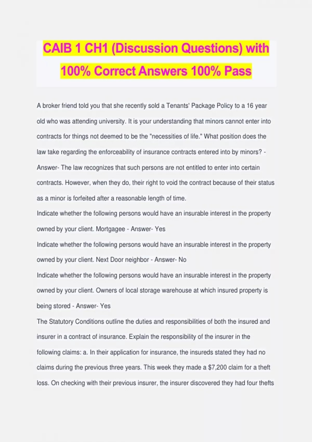 CAIB 1 CH1 (Discussion Questions) with 100% Correct Answers 100% Pass A broker friend told you that she recently sold a Tenants' Package Policy to a 16 year old who was attending university. It is your understanding that minors cannot enter into contracts for things not deemed to be the "necessities of life." What position does the law take regarding the enforceability of insurance contracts entered into by minors? - Answer- The law recognizes that such persons are not entitled to enter into certain contracts. However, when they do, their right to void the contract because of their status as a minor is forfeited after a reasonable length of time. Indicate whether the following persons would have an insurable interest in the property owned by your client. Mortgagee - Answer- Yes Indicate whether the following persons would have an insurable interest in the property owned by your client. Next Door neighbor - Answer- No Indicate whether the following persons would have an insurable interest in the property owned by your client. Owners of local storage warehouse at which insured property is being stored - Answer- Yes The Statutory Conditions outline the duties and responsibilities of both the insured and insurer in a contract of insurance. Explain the responsibility of the insurer in the following claims: a. In their application for insurance, the insureds stated they had no claims during the previous three years. This week they made a $7,200 claim for a theft loss. On checking with their previous insurer, the insurer discovered they had four thefts