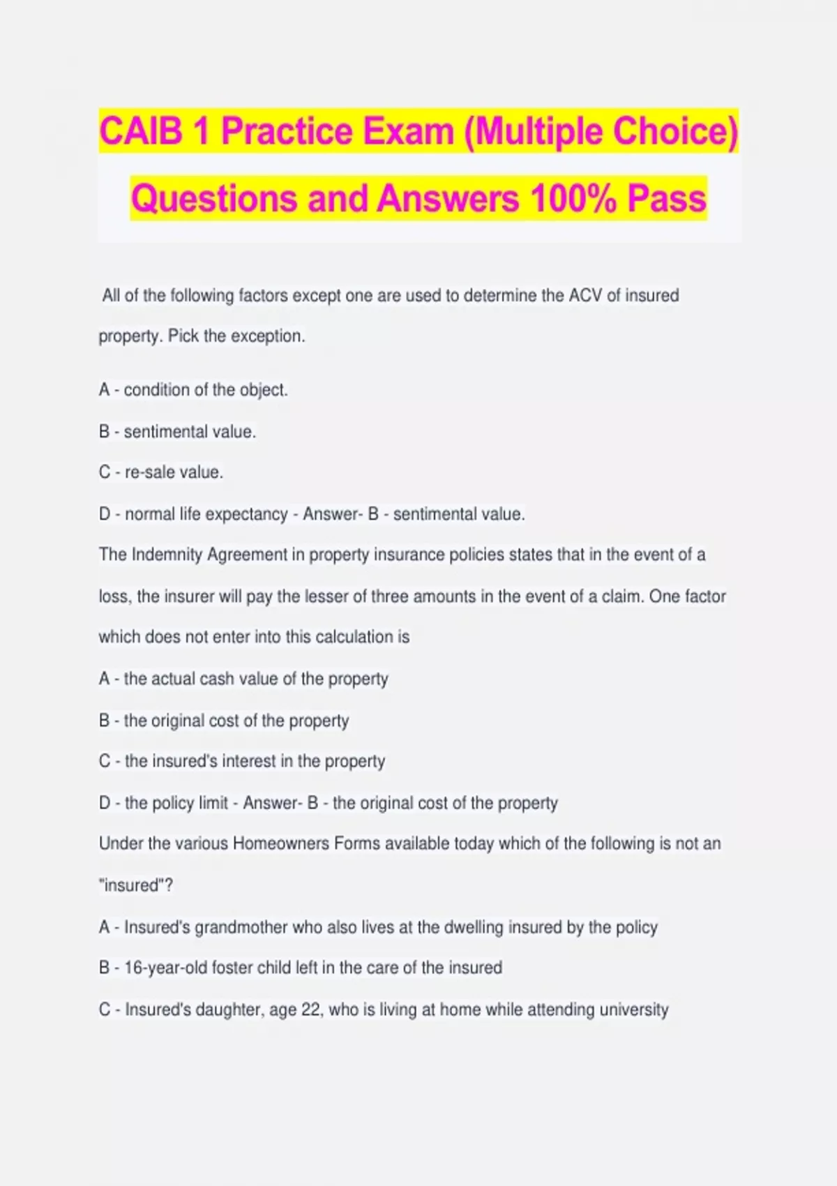 CAIB 1 Practice Exam (Multiple Choice) Questions and Answers 100% Pass All of the following factors except one are used to determine the ACV of insured property. Pick the exception. A - condition of the object. B - sentimental value. C - re-sale value. D - normal life expectancy - Answer- B - sentimental value. The Indemnity Agreement in property insurance policies states that in the event of a loss, the insurer will pay the lesser of three amounts in the event of a claim. One factor which does not enter into this calculation is A - the actual cash value of the property B - the original cost of the property C - the insured's interest in the property D - the policy limit - Answer- B - the original cost of the property Under the various Homeowners Forms available today which of the following is not an "insured"?