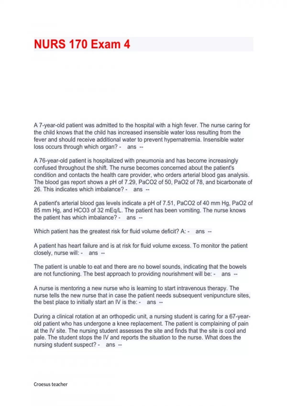 A 7-year-old patient was admitted to the hospital with a high fever. The nurse caring for the child knows that the child has increased insensible water loss resulting from the fever and should receive additional water to prevent hypernatremia. Insensible water loss occurs through which organ? - ans -- A 76-year-old patient is hospitalized with pneumonia and has become increasingly confused throughout the shift. The nurse becomes concerned about the patient's condition and contacts the health care provider, who orders arterial blood gas analysis. The blood gas report shows a pH of 7.29, PaCO2 of 50, PaO2 of 78, and bicarbonate of 26. This indicates which imbalance? - ans -- A patient's arterial blood gas levels indicate a pH of 7.51, PaCO2 of 40 mm Hg, PaO2 of 85 mm Hg, and HCO3 of 32 mEq/L. The patient has been vomiting. The nurse knows the patient has which imbalance? - ans -- Which patient has the greatest risk for fluid volume deficit? A: - ans -- A patient has heart failure and is at risk for fluid volume excess. To monitor the patient closely, nurse will: - ans -- The patient is unable to eat and there are no bowel sounds, indicating that the bowels are not functioning. The best approach to providing nourishment will be: - ans -- A nurse is mentoring a new nurse who is learning to start intravenous therapy. The nurse tells the new nurse that in case the patient needs subsequent venipuncture sites, the best place to initially start an IV is the: - ans -- During a clinical rotation at an orthopedic unit, a nursing student is caring for a 67-year-old patient who has undergone a knee replacement. The patient is complaining of pain at the IV site. The nursing student assesses the site and finds that the site is cool and pale. The student stops the IV and reports the situation to the nurse. What does the nursing student suspect? - ans --