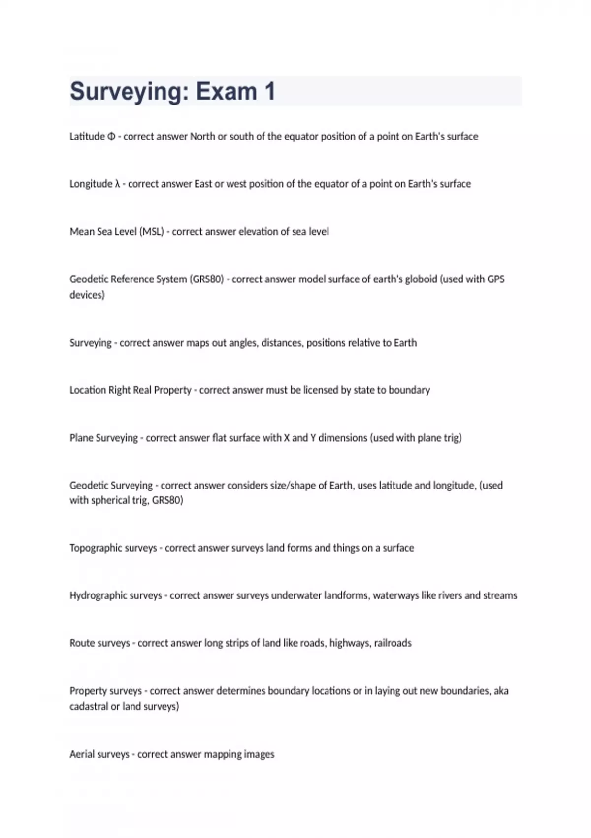 Surveying: Exam 1Latitude Φ - correct answer North or south of the equator position of a point on Earth's surface Longitude λ - correct answer East or west position of the equator of a point on Earth's surface Mean Sea Level (MSL) - correct answer elevation of sea level Geodetic Reference System (GRS80) - correct answer model surface of earth's globoid (used with GPS devices) Surveying - correct answer maps out angles, distances, positions relative to Earth Location Right Real Property - correct answer must be licensed by state to boundary Plane Surveying - correct answer flat surface with X and Y dimensions (used with plane trig) Geodetic Surveying - correct answer considers size/shape of Earth, uses latitude and longitude, (used with spherical trig, GRS80) Topographic surveys - correct answer surveys land forms and things on a surface Hydrographic surveys - correct answer surveys underwater landforms, waterways like rivers and streams Route surveys - correct answer long strips of land like roads, highways, railroads Property surveys - correct answer determines boundary locations or in laying out new boundaries, aka cadastral or land surveys) Aerial surveys - correct answer mapping images