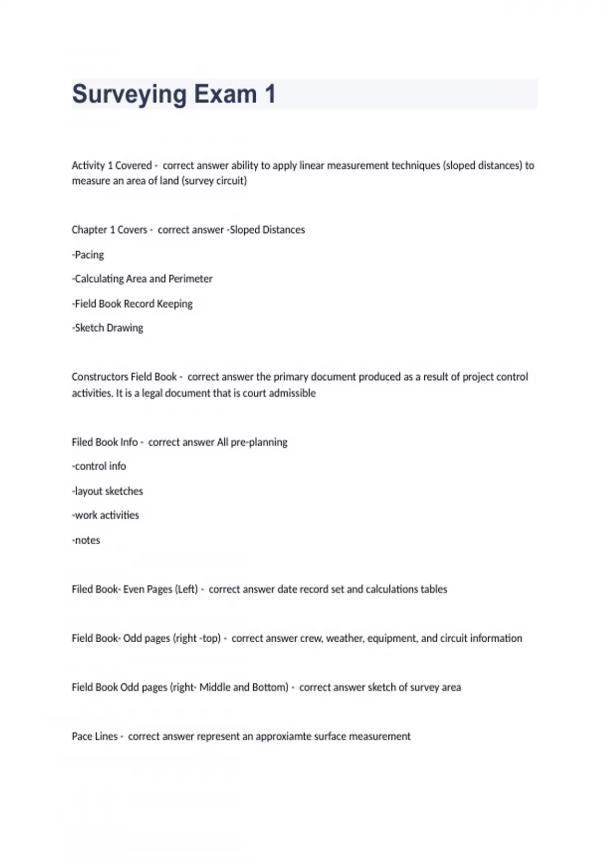 Surveying Exam 1Activity 1 Covered - correct answer ability to apply linear measurement techniques (sloped distances) to measure an area of land (survey circuit) Chapter 1 Covers - correct answer -Sloped Distances -Pacing -Calculating Area and Perimeter -Field Book Record Keeping -Sketch Drawing Constructors Field Book - correct answer the primary document produced as a result of project control activities. It is a legal document that is court admissible Filed Book Info - correct answer All pre-planning -control info -layout sketches -work activities -notes Filed Book- Even Pages (Left) - correct answer date record set and calculations tables Field Book- Odd pages (right -top) - correct answer crew, weather, equipment, and circuit information Field Book Odd pages (right- Middle and Bottom) - correct answer sketch of survey area Pace Lines - correct answer represent an approxiamte surface measurement