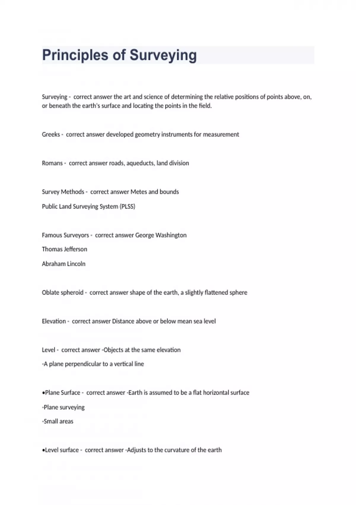 Principles of SurveyingSurveying - correct answer the art and science of determining the relative positions of points above, on, or beneath the earth's surface and locating the points in the field. Greeks - correct answer developed geometry instruments for measurement Romans - correct answer roads, aqueducts, land division Survey Methods - correct answer Metes and bounds Public Land Surveying System (PLSS) Famous Surveyors - correct answer George Washington Thomas Jefferson Abraham Lincoln Oblate spheroid - correct answer shape of the earth, a slightly flattened sphere Elevation - correct answer Distance above or below mean sea level Level - correct answer -Objects at the same elevation -A plane perpendicular to a vertical line •Plane Surface - correct answer -Earth is assumed to be a flat horizontal surface -Plane surveying -Small areas •Level surface - correct answer -Adjusts to the curvature of the earth