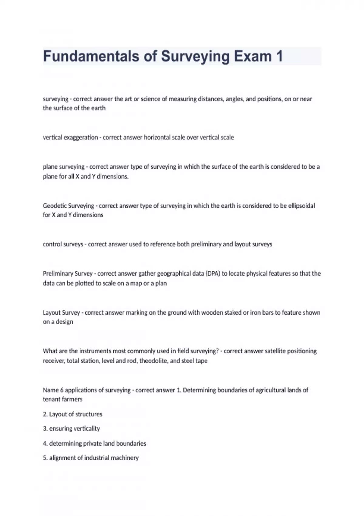Fundamentals of Surveying Exam 1surveying - correct answer the art or science of measuring distances, angles, and positions, on or near the surface of the earth vertical exaggeration - correct answer horizontal scale over vertical scale plane surveying - correct answer type of surveying in which the surface of the earth is considered to be a plane for all X and Y dimensions. Geodetic Surveying - correct answer type of surveying in which the earth is considered to be ellipsoidal for X and Y dimensions control surveys - correct answer used to reference both preliminary and layout surveys Preliminary Survey - correct answer gather geographical data (DPA) to locate physical features so that the data can be plotted to scale on a map or a plan Layout Survey - correct answer marking on the ground with wooden staked or iron bars to feature shown on a design What are the instruments most commonly used in field surveying? - correct answer satellite positioning receiver, total station, level and rod, theodolite, and steel tape Name 6 applications of surveying - correct answer 1. Determining boundaries of agricultural lands of tenant farmers 2. Layout of structures 3. ensuring verticality 4. determining private land boundaries 5. alignment of industrial machinery