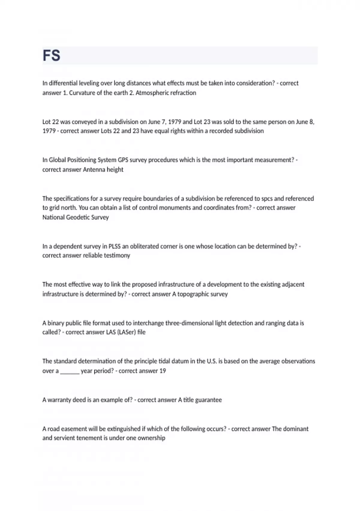 FSIn differential leveling over long distances what effects must be taken into consideration? - correct answer 1. Curvature of the earth 2. Atmospheric refraction Lot 22 was conveyed in a subdivision on June 7, 1979 and Lot 23 was sold to the same person on June 8, 1979 - correct answer Lots 22 and 23 have equal rights within a recorded subdivision In Global Positioning System GPS survey procedures which is the most important measurement? - correct answer Antenna height The specifications for a survey require boundaries of a subdivision be referenced to spcs and referenced to grid north. You can obtain a list of control monuments and coordinates from? - correct answer National Geodetic Survey In a dependent survey in PLSS an obliterated corner is one whose location can be determined by? - correct answer reliable testimony The most effective way to link the proposed infrastructure of a development to the existing adjacent infrastructure is determined by? - correct answer A topographic survey A binary public file format used to interchange three-dimensional light detection and ranging data is called? - correct answer LAS (LASer) file The standard determination of the principle tidal datum in the U.S. is based on the average observations over a ______ year period? - correct answer 19 A warranty deed is an example of? - correct answer A title guarantee A road easement will be extinguished if which of the following occurs? - correct answer The dominant and servient tenement is under one ownership When performing project research it is necessary to review the historical recording dates of all deeds for the subject property and adjoining properties to determine: - correct answer order of conveyance What is the maximum number of CORS (Continuously Operating Reference Stations) that OPUS static (Online Positioning User Service) can use when processing a submitted GPS observation file? - correct answer 3 Geodetic heights obtained with satellite surveys are: - correct answer measured with respect to the ellipsoid When elevations are produced for a survey project using GNSS the limiting factor is a: - correct answer precise geoid model In a Lambert projection all the lines that are equal distance apart are: - correct answer standard parallels Misclosure vs survey length - correct answer Relative Accuracy One point vs datum (other points) - correct answer Network/Local accuracy Survey point group vs Error ellipse - correct answer Positional accuracy Precision shooting the same point again and again - correct answer Accuracy surveying the correct point Your measurements compared with an error eclipse - correct answer Positional accuracy The standard for reporting positional accuracy is defined in two components horizontal and vertical - correct answer The standard for the horizontal component as published by the NGS is the radius of a circle of uncertainty NGVD29 - correct answer National Geodetic Vertical Datum of 1929 Meade Ranch Kansas