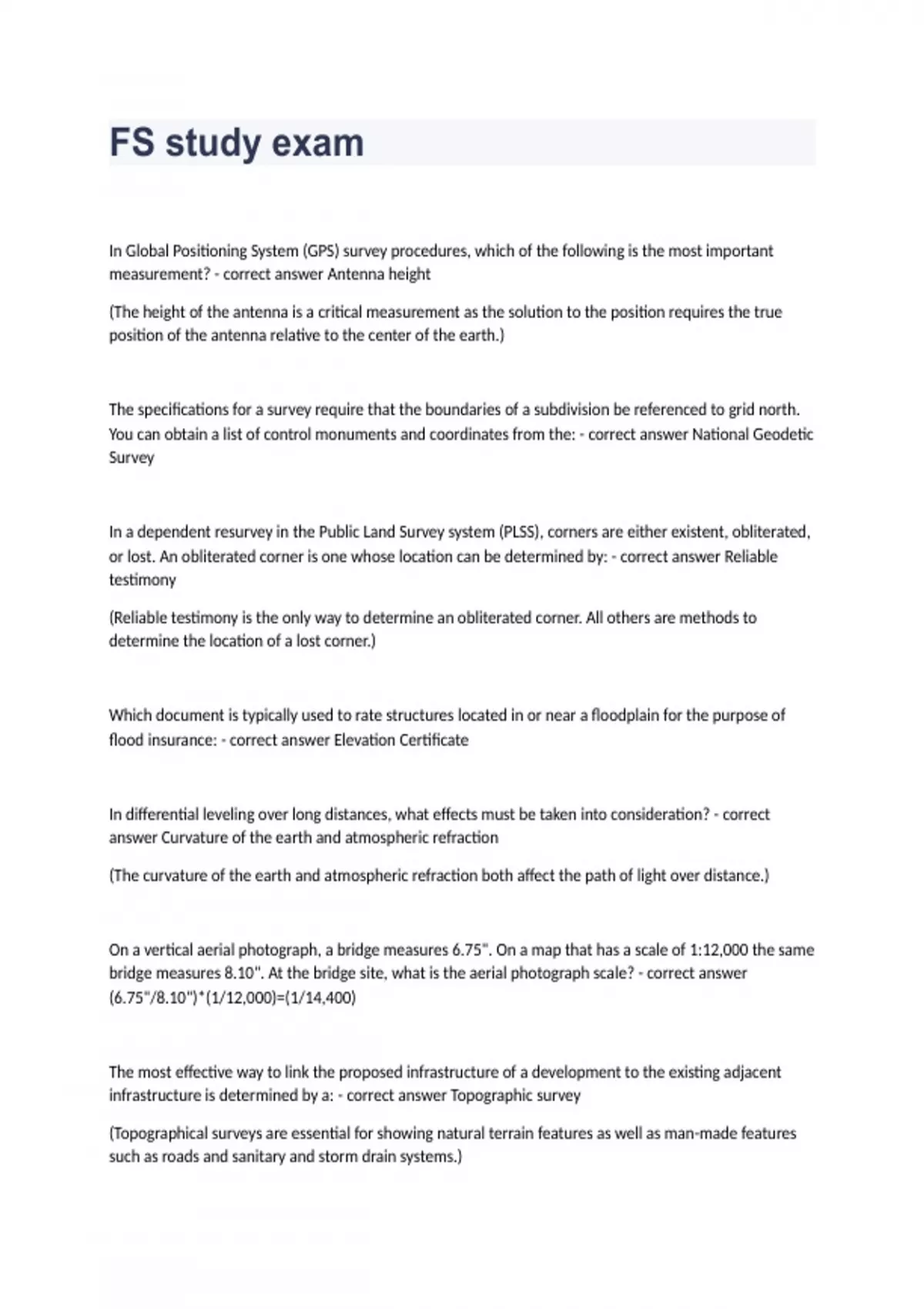 FS study examIn Global Positioning System (GPS) survey procedures, which of the following is the most important measurement? - correct answer Antenna height (The height of the antenna is a critical measurement as the solution to the position requires the true position of the antenna relative to the center of the earth.) The specifications for a survey require that the boundaries of a subdivision be referenced to grid north. You can obtain a list of control monuments and coordinates from the: - correct answer National Geodetic Survey In a dependent resurvey in the Public Land Survey system (PLSS), corners are either existent, obliterated, or lost. An obliterated corner is one whose location can be determined by: - correct answer Reliable testimony (Reliable testimony is the only way to determine an obliterated corner. All others are methods to determine the location of a lost corner.) Which document is typically used to rate structures located in or near a floodplain for the purpose of flood insurance: - correct answer Elevation Certificate In differential leveling over long distances, what effects must be taken into consideration? - correct answer Curvature of the earth and atmospheric refraction (The curvature of the earth and atmospheric refraction both affect the path of light over distance.) On a vertical aerial photograph, a bridge measures 6.75". On a map that has a scale of 1:12,000 the same bridge measures 8.10". At the bridge site, what is the aerial photograph scale? - correct answer (6.75"/8.10")*(1/12,000)=(1/14,400) The most effective way to link the proposed infrastructure of a development to the existing adjacent infrastructure is determined by a: - correct answer Topographic survey (Topographical surveys are essential for showing natural terrain features as well as man-made features such as roads and sanitary and storm drain systems.)