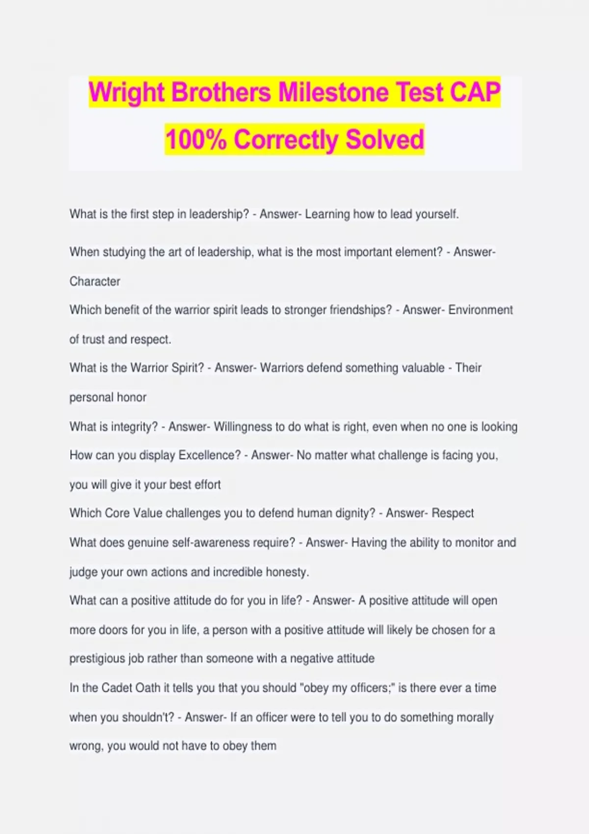Wright Brothers Milestone Test CAP 100% Correctly Solved What is the first step in leadership? - Answer- Learning how to lead yourself. When studying the art of leadership, what is the most important element? - Answer- Character Which benefit of the warrior spirit leads to stronger friendships? - Answer- Environment of trust and respect. What is the Warrior Spirit? - Answer- Warriors defend something valuable - Their personal honor What is integrity? - Answer- Willingness to do what is right, even when no one is looking How can you display Excellence? - Answer- No matter what challenge is facing you, you will give it your best effort Which Core Value challenges you to defend human dignity? - Answer- Respect What does genuine self-awareness require? - Answer- Having the ability to monitor and judge your own actions and incredible honesty. What can a positive attitude do for you in life? - Answer- A positive attitude will open more doors for you in life, a person with a positive attitude will likely be chosen for a prestigious job rather than someone with a negative attitude In the Cadet Oath it tells you that you should "obey my officers;" is there ever a time when you shouldn't? - Answer- If an officer were to tell you to do something morally wrong, you would not have to obey them