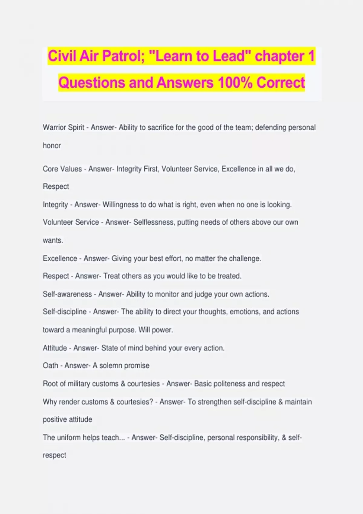 Civil Air Patrol; "Learn to Lead" chapter 1 Questions and Answers 100% Correct Warrior Spirit - Answer- Ability to sacrifice for the good of the team; defending personal honor Core Values - Answer- Integrity First, Volunteer Service, Excellence in all we do, Respect Integrity - Answer- Willingness to do what is right, even when no one is looking. Volunteer Service - Answer- Selflessness, putting needs of others above our own wants. Excellence - Answer- Giving your best effort, no matter the challenge. Respect - Answer- Treat others as you would like to be treated. Self-awareness - Answer- Ability to monitor and judge your own actions. Self-discipline - Answer- The ability to direct your thoughts, emotions, and actions toward a meaningful purpose. Will power.