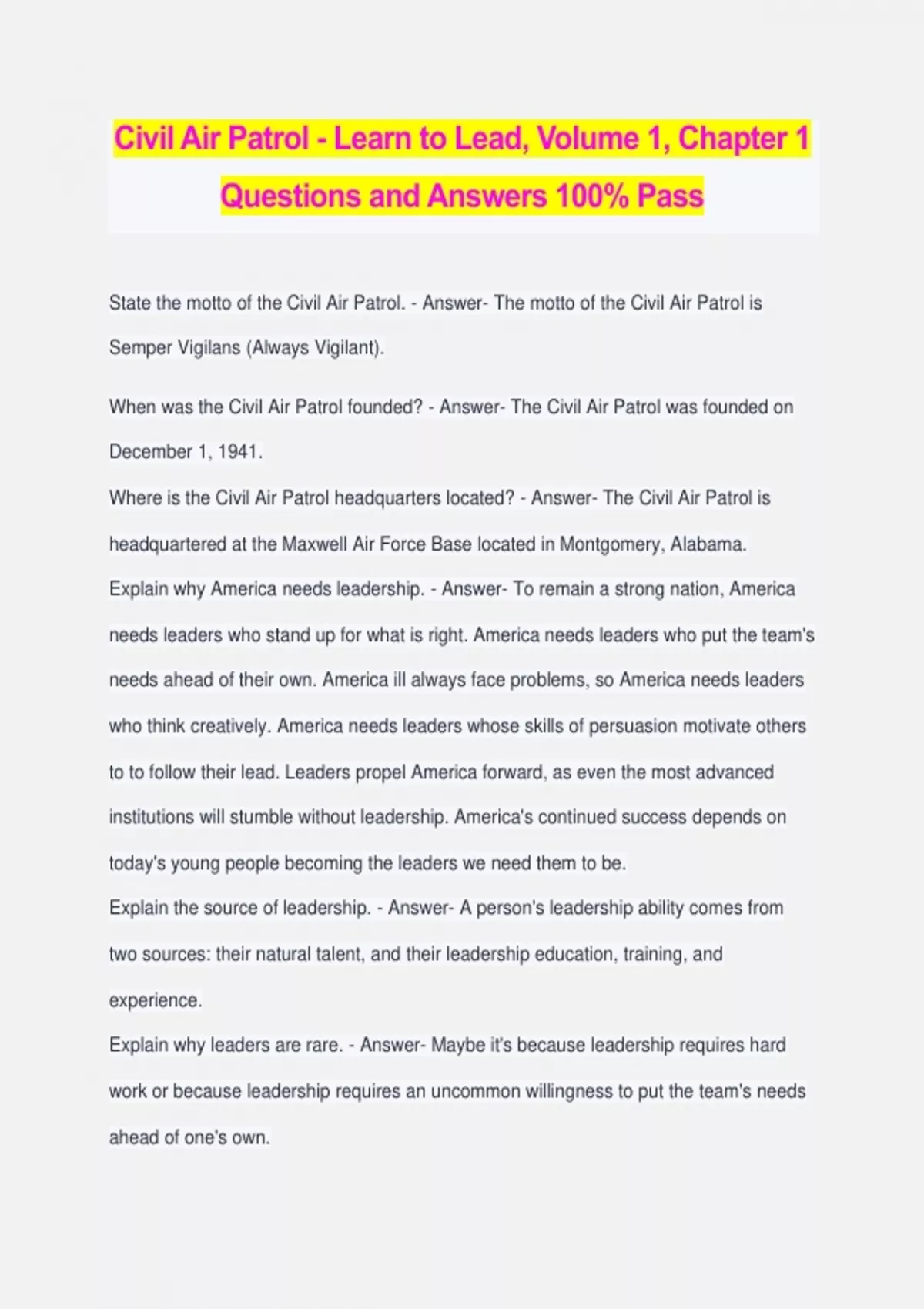 Civil Air Patrol - Learn to Lead, Volume 1, Chapter 1 Questions and Answers 100% Pass State the motto of the Civil Air Patrol. - Answer- The motto of the Civil Air Patrol is Semper Vigilans (Always Vigilant). When was the Civil Air Patrol founded? - Answer- The Civil Air Patrol was founded on December 1, 1941. Where is the Civil Air Patrol headquarters located? - Answer- The Civil Air Patrol is headquartered at the Maxwell Air Force Base located in Montgomery, Alabama. Explain why America needs leadership. - Answer- To remain a strong nation, America needs leaders who stand up for what is right. America needs leaders who put the team's needs ahead of their own. America ill always face problems, so America needs leaders who think creatively. America needs leaders whose skills of persuasion motivate others to to follow their lead. Leaders propel America forward, as even the most advanced institutions will stumble without leadership. America's continued success depends on today's young people becoming the leaders we need them to be. Explain the source of leadership. - Answer- A person's leadership ability comes from two sources: their natural talent, and their leadership education, training, and experience. Explain why leaders are rare. - Answer- Maybe it's because leadership requires hard work or because leadership requires an uncommon willingness to put the team's needs ahead of one's own. Explain the first step in leadership. - Answer- The first step in leadership is learning how to lead yourself. This includes learning how to contribute to a team, how to wear the uniform, how to drill, and how to follow the guidance of the leaders above you. What does the study of the art of leadership begin with? - Answer- The study of the art of leadership should begin with its most important element, character. Explain what a "warrior" is in the context of the "warrior spirit". - Answer- A warrior is someone whose strong character enables them to make sacrifices for the team and achieve their long-term goals. Warriors defend their personal honor. The Air Force defines the warrior spirit as a condition of the heart: a tough-mindedness and tireless motivation. Describe the hallmarks of the warrior spirit. - Answer- Having a warrior spirit means that you make a promise to yourself that you will not lie, cheat, or steal, even if everyone else commits these wrongs.
