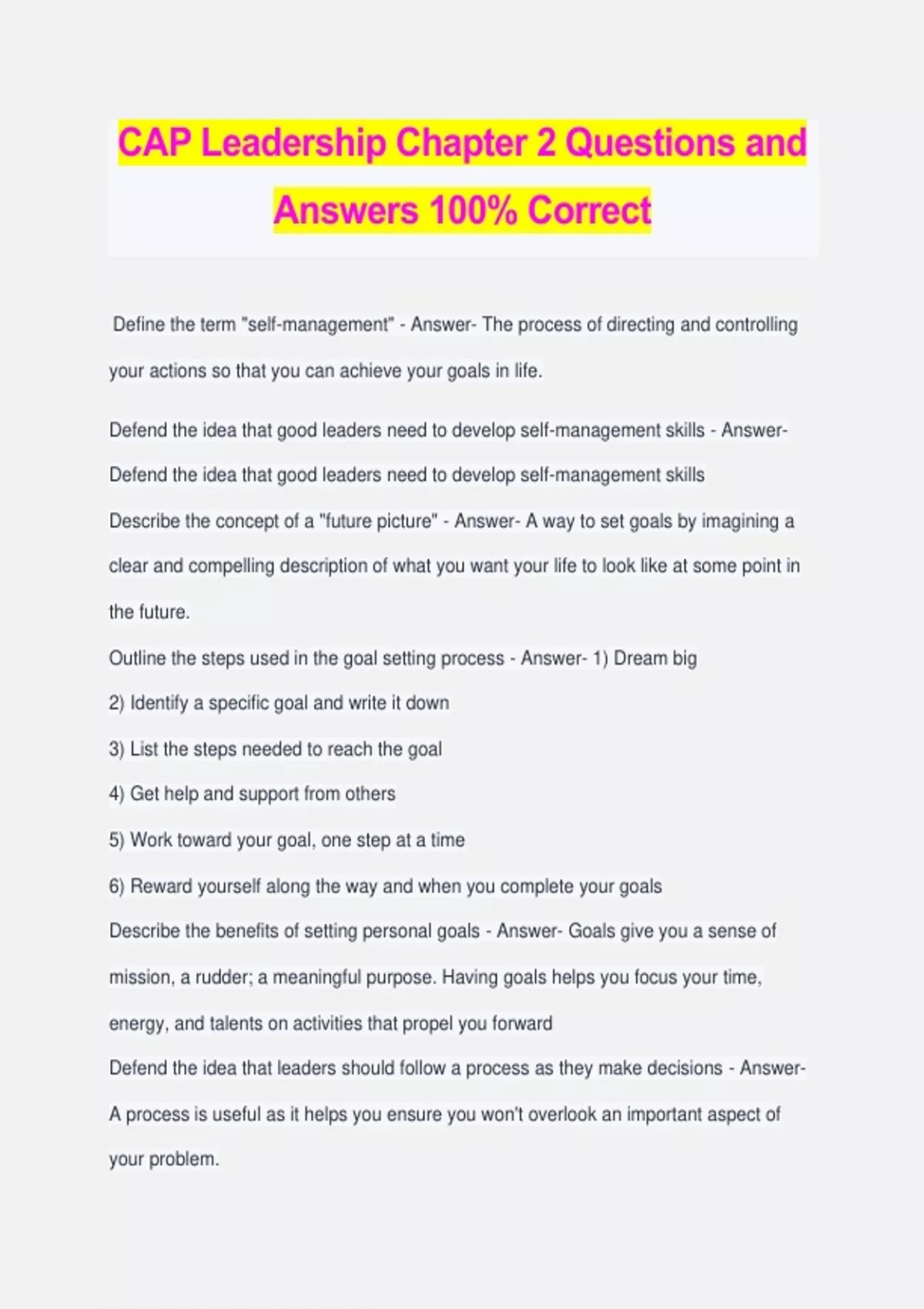 CAP Leadership Chapter 2 Questions and Answers 100% Correct Define the term "self-management" - Answer- The process of directing and controlling your actions so that you can achieve your goals in life. Defend the idea that good leaders need to develop self-management skills - Answer- Defend the idea that good leaders need to develop self-management skills Describe the concept of a "future picture" - Answer- A way to set goals by imagining a clear and compelling description of what you want your life to look like at some point in the future. Outline the steps used in the goal setting process - Answer- 1) Dream big 2) Identify a specific goal and write it down 3) List the steps needed to reach the goal 4) Get help and support from others 5) Work toward your goal, one step at a time 6) Reward yourself along the way and when you complete your goals Describe the benefits of setting personal goals - Answer- Goals give you a sense of mission, a rudder; a meaningful purpose. Having goals helps you focus your time, energy, and talents on activities that propel you forward Defend the idea that leaders should follow a process as they make decisions - Answer- A process is useful as it helps you ensure you won't overlook an important aspect of your problem. Identify and describe the 7 steps used in the ethical decision making process - Answer- 1) Stop, think, and define the problem. (Don't make a foolish decision under pressure and without knowing exactly what the problem is.) 2) Get the facts. (Have adequate information to support an intelligent choice, and differentiate between facts, opinions, and assumptions.) 3) Brainstorm and list options. (Build a list of possible solutions without judging them. Seek help from others.) 4) Weigh the options. (Consider pros, cons, and consequences of each choice, and consider effect on stakeholders.) 5) Consider your values. (Make an ethical decision. If reported in the news, will you be proud or ashamed?) 6) Decide and act. (Pause if you can, talk with those you respect.) 7) Re-evaluate the decision. (How well is solution working? Good leaders re-evaluate and change course if necessary.