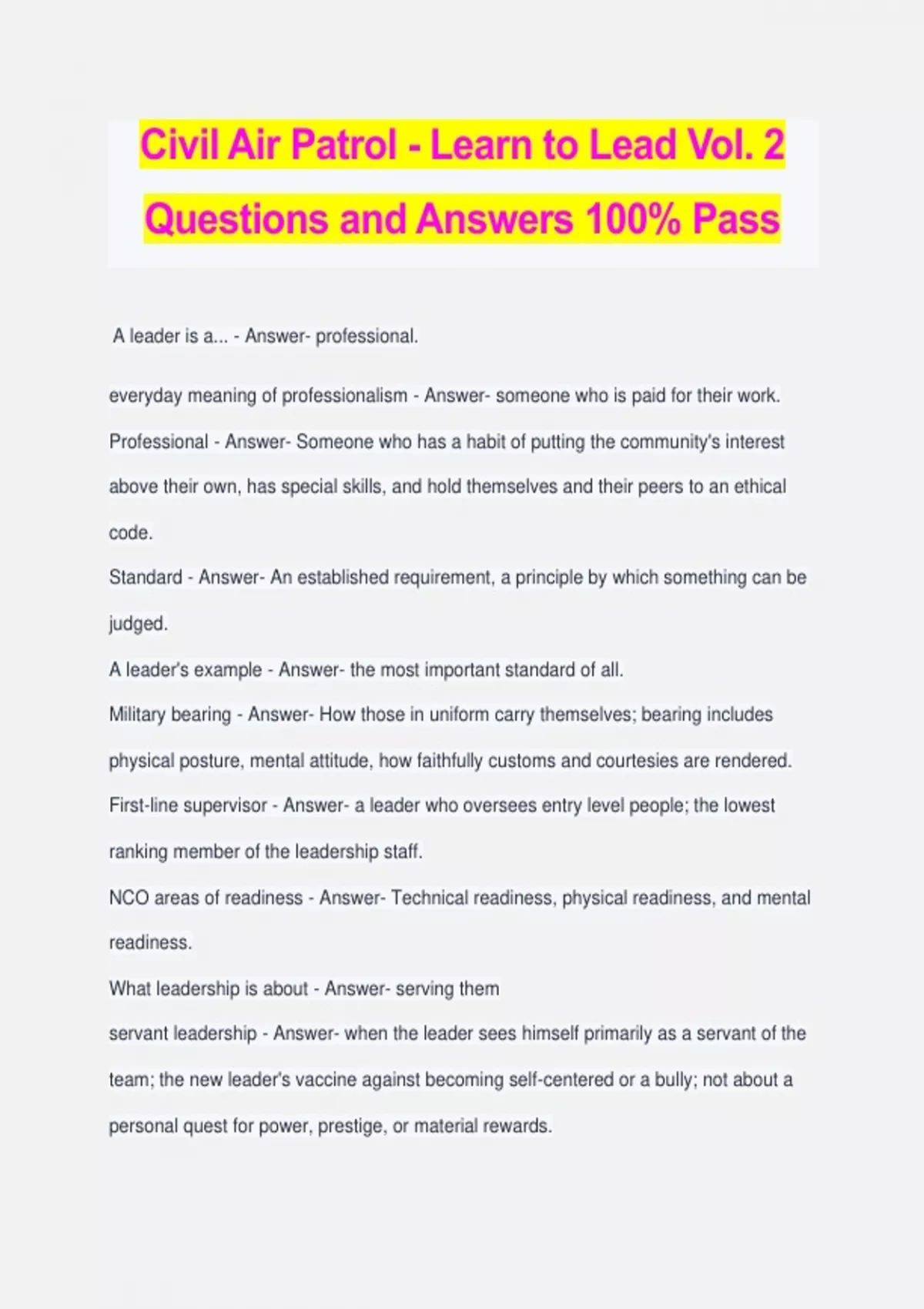 Civil Air Patrol - Learn to Lead Vol. 2 Questions and Answers 100% Pass A leader is a... - Answer- professional. everyday meaning of professionalism - Answer- someone who is paid for their work. Professional - Answer- Someone who has a habit of putting the community's interest above their own, has special skills, and hold themselves and their peers to an ethical code. Standard - Answer- An established requirement, a principle by which something can be judged. A leader's example - Answer- the most important standard of all. Military bearing - Answer- How those in uniform carry themselves; bearing includes physical posture, mental attitude, how faithfully customs and courtesies are rendered. First-line supervisor - Answer- a leader who oversees entry level people; the lowest ranking member of the leadership staff. NCO areas of readiness - Answer- Technical readiness, physical readiness, and mental readiness. What leadership is about - Answer- serving them servant leadership - Answer- when the leader sees himself primarily as a servant of the team; the new leader's vaccine against becoming self-centered or a bully; not about a personal quest for power, prestige, or material rewards. Coaching - Answer- the process through which leaders try to solve performance problems and develop their people; a person-to-person experience, a relationship between an inexperienced person and an experienced person. Elements of coaching - Answer- dialogue, empowerment, action, & improvement. Techniques of successful coaching - Answer- observation, purpose, dialogue, and follow-up. Tactics of Dialogue - Answer- mirroring, questioning, active listening, validating, story- shifting, addressing fears, finding the bottom line, and providing direct feedback. open-ended question - Answer- a question that requires more than a "yes" or "no" answer. Validating - Answer- Simply having someone acknowledge they understand what you are going through. Story shift - Answer- Where the coach asks the trainee to look at the problem in a different way or from someone else's perspective. Fear - Answer- Can stop a person from moving forward. Bottom line approach - Answer- Where a coach helps the coaches express the problem in one or two simple sentences