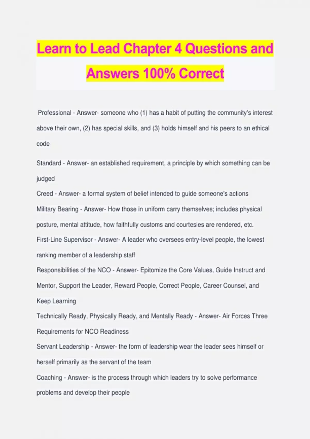 Learn to Lead Chapter 4 Questions and Answers 100% Correct Professional - Answer- someone who (1) has a habit of putting the community's interest above their own, (2) has special skills, and (3) holds himself and his peers to an ethical code Standard - Answer- an established requirement, a principle by which something can be judged Creed - Answer- a formal system of belief intended to guide someone's actions Military Bearing - Answer- How those in uniform carry themselves; includes physical posture, mental attitude, how faithfully customs and courtesies are rendered, etc. First-Line Supervisor - Answer- A leader who oversees entry-level people, the lowest ranking member of a leadership staff Responsibilities of the NCO - Answer- Epitomize the Core Values, Guide Instruct and Mentor, Support the Leader, Reward People, Correct People, Career Counsel, and Keep Learning Technically Ready, Physically Ready, and Mentally Ready - Answer- Air Forces Three Requirements for NCO Readiness