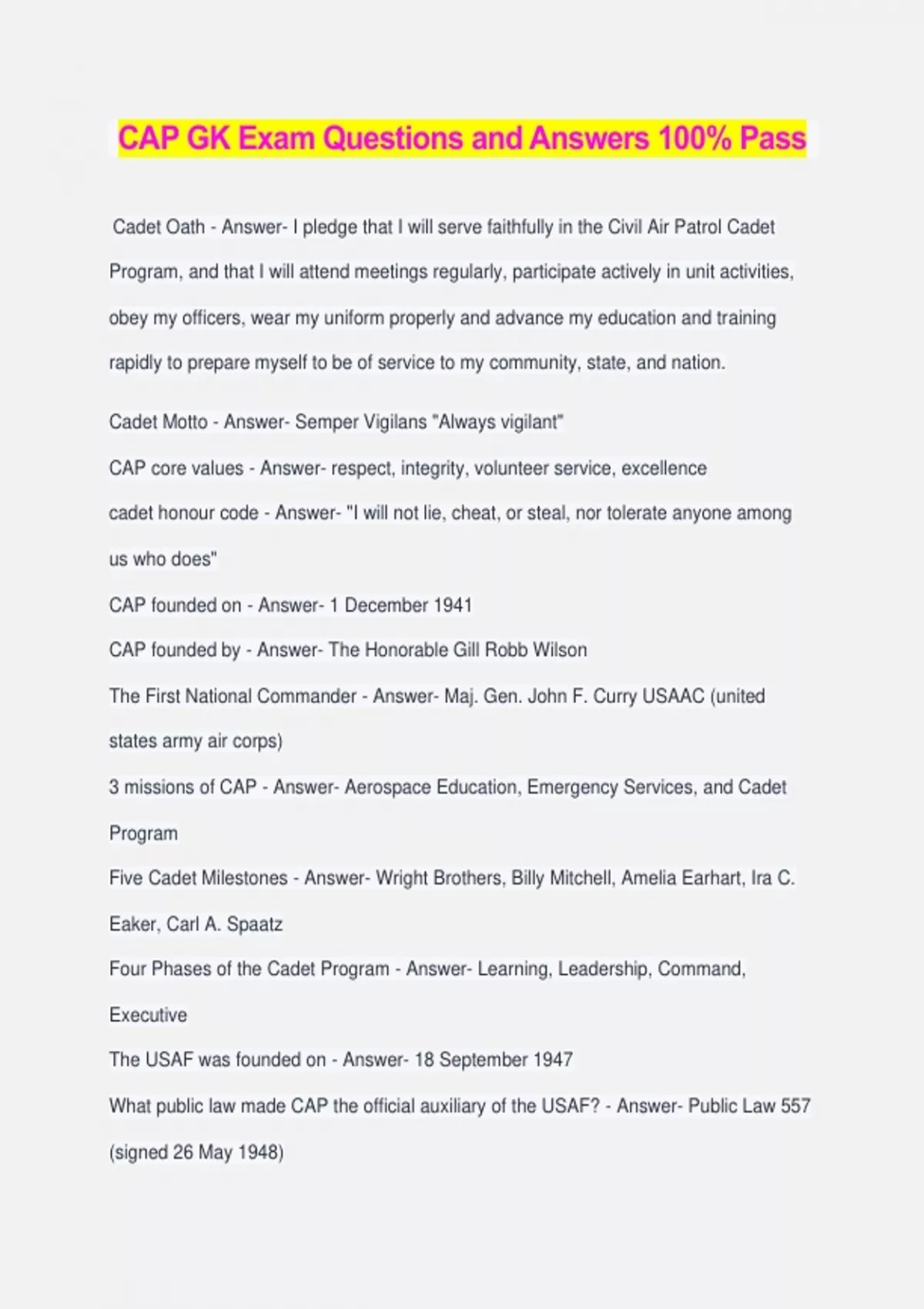 CAP GK Exam Questions and Answers 100% Pass Cadet Oath - Answer- I pledge that I will serve faithfully in the Civil Air Patrol Cadet Program, and that I will attend meetings regularly, participate actively in unit activities, obey my officers, wear my uniform properly and advance my education and training rapidly to prepare myself to be of service to my community, state, and nation. Cadet Motto - Answer- Semper Vigilans "Always vigilant" CAP core values - Answer- respect, integrity, volunteer service, excellence cadet honour code - Answer- "I will not lie, cheat, or steal, nor tolerate anyone among us who does" CAP founded on - Answer- 1 December 1941 CAP founded by - Answer- The Honorable Gill Robb Wilson The First National Commander - Answer- Maj. Gen. John F. Curry USAAC (united states army air corps)
