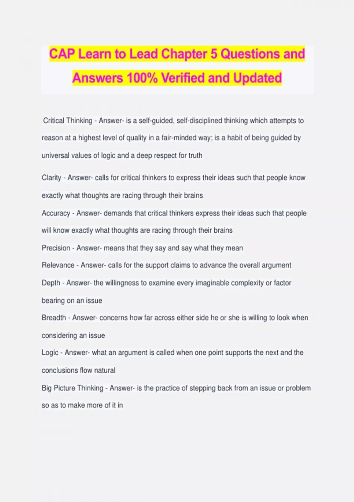 CAP Learn to Lead Chapter 5 Questions and Answers 100% Verified and Updated Critical Thinking - Answer- is a self-guided, self-disciplined thinking which attempts to reason at a highest level of quality in a fair-minded way; is a habit of being guided by universal values of logic and a deep respect for truth Clarity - Answer- calls for critical thinkers to express their ideas such that people know exactly what thoughts are racing through their brains Accuracy - Answer- demands that critical thinkers express their ideas such that people will know exactly what thoughts are racing through their brains Precision - Answer- means that they say and say what they mean Relevance - Answer- calls for the support claims to advance the overall argument Depth - Answer- the willingness to examine every imaginable complexity or factor bearing on an issue Breadth - Answer- concerns how far across either side he or she is willing to look when considering an issue Logic - Answer- what an argument is called when one point supports the next and the conclusions flow natural