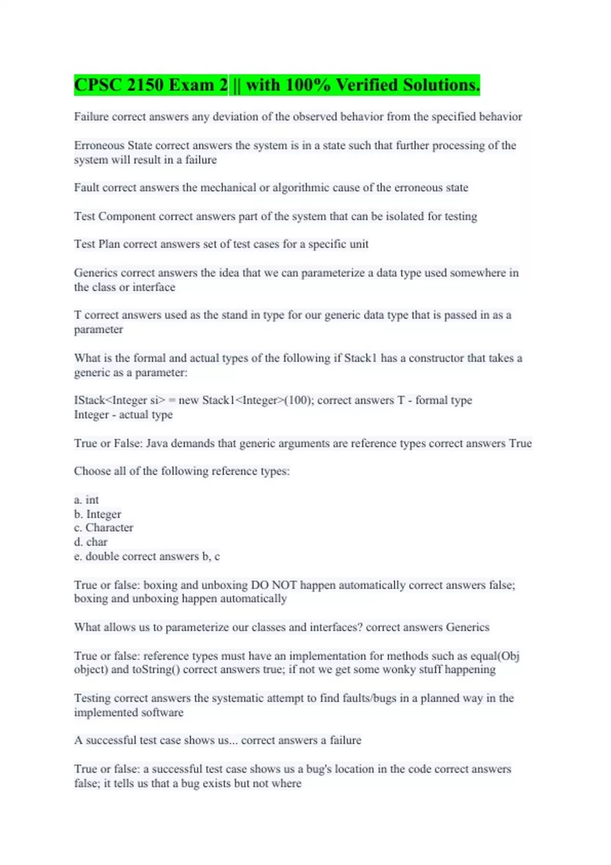 Failure correct answers any deviation of the observed behavior from the specified behavior Erroneous State correct answers the system is in a state such that further processing of the system will result in a failure Fault correct answers the mechanical or algorithmic cause of the erroneous state Test Component correct answers part of the system that can be isolated for testing Test Plan correct answers set of test cases for a specific unit Generics correct answers the idea that we can parameterize a data type used somewhere in the class or interface T correct answers used as the stand in type for our generic data type that is passed in as a parameter What is the formal and actual types of the following if Stack1 has a constructor that takes a generic as a parameter: IStack<Integer si> = new Stack1<Integer>(100); correct answers T - formal type Integer - actual type True or False: Java demands that generic arguments are reference types correct answers True Choose all of the following reference types: a. int b. Integer c. Character d. char e. double correct answers b, c True or false: boxing and unboxing DO NOT happen automatically correct answers false; boxing and unboxing happen automatically What allows us to parameterize our classes and interfaces? correct answers Generics True or false: reference types must have an implementation for methods such as equal(Obj object) and toString() correct answers true; if not we get some wonky stuff happening Testing correct answers the systematic attempt to find faults/bugs in a planned way in the implemented software A successful test case shows us... correct answers a failure True or false: a successful test case shows us a bug's location in the code correct answers false; it tells us that a bug exists but not where