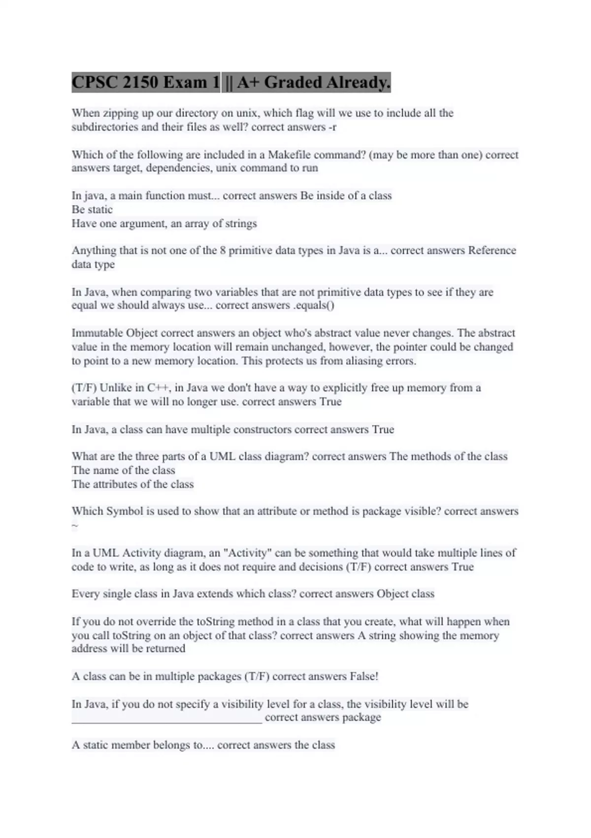 When zipping up our directory on unix, which flag will we use to include all the subdirectories and their files as well? correct answers -r Which of the following are included in a Makefile command? (may be more than one) correct answers target, dependencies, unix command to run In java, a main function must... correct answers Be inside of a class Be static Have one argument, an array of strings Anything that is not one of the 8 primitive data types in Java is a... correct answers Reference data type In Java, when comparing two variables that are not primitive data types to see if they are equal we should always use... correct answers .equals() Immutable Object correct answers an object who's abstract value never changes. The abstract value in the memory location will remain unchanged, however, the pointer could be changed to point to a new memory location. This protects us from aliasing errors. (T/F) Unlike in C++, in Java we don't have a way to explicitly free up memory from a variable that we will no longer use. correct answers True In Java, a class can have multiple constructors correct answers True What are the three parts of a UML class diagram? correct answers The methods of the class The name of the class The attributes of the class Which Symbol is used to show that an attribute or method is package visible? correct answers ~ In a UML Activity diagram, an "Activity" can be something that would take multiple lines of code to write, as long as it does not require and decisions (T/F) correct answers True Every single class in Java extends which class? correct answers Object class If you do not override the toString method in a class that you create, what will happen when you call toString on an object of that class? correct answers A string showing the memory address will be returned A class can be in multiple packages (T/F) correct answers False! In Java, if you do not specify a visibility level for a class, the visibility level will be ________________________________ correct answers package A static member belongs to.... correct answers the class