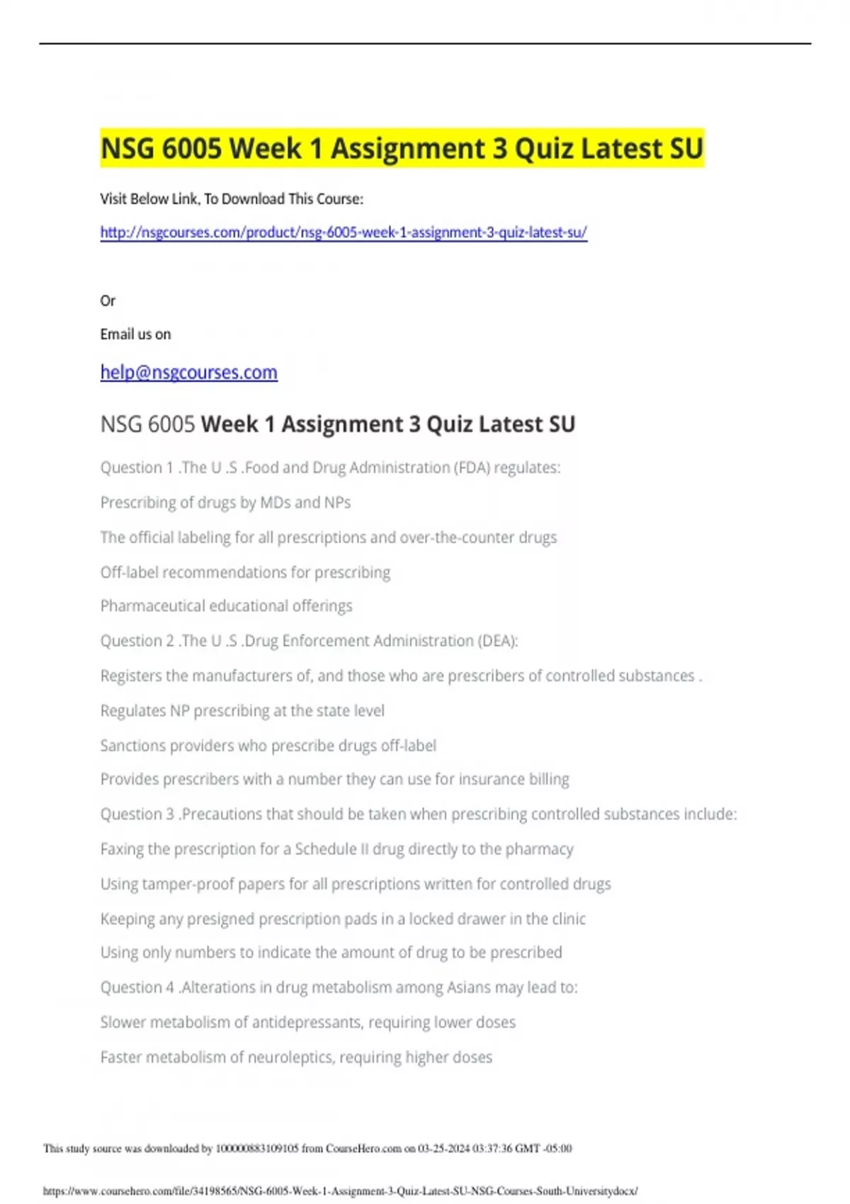 nsg 6005 week 1 assignment 3 quiz latest su