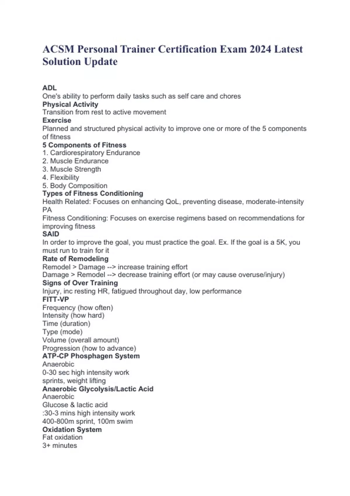 ACSM Personal Trainer Certification Exam 2024 Latest Solution Update ADL One's ability to perform daily tasks such as self care and chores Physical Activity Transition from rest to active movement Exercise Planned and structured physical activity to improve one or more of the 5 components of fitness 5 Components of Fitness 1. Cardiorespiratory Endurance 2. Muscle Endurance 3. Muscle Strength 4. Flexibility 5. Body Composition Types of Fitness Conditioning Health Related: Focuses on enhancing QoL, preventing disease, moderate-intensity PA Fitness Conditioning: Focuses on exercise regimens based on recommendations for improving fitness SAID In order to improve the goal, you must practice the goal. Ex. If the goal is a 5K, you must run to train for it Rate of Remodeling Remodel > Damage --> increase training effort Damage > Remodel --> decrease training effort (or may cause overuse/injury) Signs of Over Training Injury, inc resting HR, fatigued throughout day, low performance FITT-VP Frequency (how often) Intensity (how hard) Time (duration) Type (mode) Volume (overall amount) Progression (how to advance) ATP-CP Phosphagen System Anaerobic 0-30 sec high intensity work sprints, weight lifting Anaerobic Glycolysis/Lactic Acid Anaerobic Glucose & lactic acid :30-3 mins high intensity work 400-800m sprint, 100m swim Oxidation System Fat oxidation