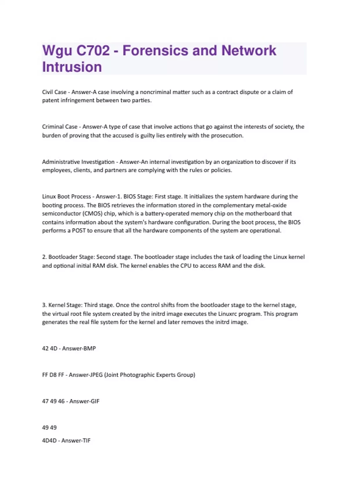 Civil Case - Answer-A case involving a noncriminal matter such as a contract dispute or a claim of patent infringement between two parties. Criminal Case - Answer-A type of case that involve actions that go against the interests of society, the burden of proving that the accused is guilty lies entirely with the prosecution. Administrative Investigation - Answer-An internal investigation by an organization to discover if its employees, clients, and partners are complying with the rules or policies. Linux Boot Process - Answer-1. BIOS Stage: First stage. It initializes the system hardware during the booting process. The BIOS retrieves the information stored in the complementary metal-oxide semiconductor (CMOS) chip, which is a battery-operated memory chip on the motherboard that contains information about the system's hardware configuration. During the boot process, the BIOS performs a POST to ensure that all the hardware components of the system are operational. 2. Bootloader Stage: Second stage. The bootloader stage includes the task of loading the Linux kernel and optional initial RAM disk. The kernel enables the CPU to access RAM and the disk. 3. Kernel Stage: Third stage. Once the control shifts from the bootloader stage to the kernel stage, the virtual root file system created by the initrd image executes the Linuxrc program. This program generates the real file system for the kernel and later removes the initrd image. 42 4D - Answer-BMP FF D8 FF - Answer-JPEG (Joint Photographic Experts Group) 47 49 46 - Answer-GIF 49 49 4D4D - Answer-TIFTIFF Virtual File System (VFS) - Answer-a common software interface that sits between the kernel and real file systems. We can mount multiple different types of file systems on the same Linux installation, and they will appear uniform to the user and to all other applications; examples include /proc/, /sys/,/boot/initramfs, devtmpfs, and debugfs Superblock - Magic number - Answer-Allows the mounting software to verify the Superblock for the ext2 file system. For the present ext2 version, it is 0xEF53. Superblock - Revision Level - Answer-The major and minor revision levels allow the mounting code to determine whether a file system supports features that are only available in particular revisions of the file system. Superblock - Mount count - Answer-These allow the system to determine if it needs to fully check the file system. The mount count is incremented each time the system mounts the file system. Sector - Answer-Section of the platter holding data. Shaped like a slice of pizza. Tracks - Answer-The tracks are the thin concentric circular strips of sectors. At least one head is required to read a single track. Cylinders - Answer-A cylinder is a division of data in a disk drive, as used in the CHS addressing mode of a Fixed Block Architecture disk or the cylinder-head-record (CCHHR) addressing mode of a CKD disk. Head - Answer-Reads and writes data in a hard drive by manipulating the magnetic medium that composes the surface of an associated disk platter. Clusters - Answer-These are the smallest accessible storage units on a hard disk. File systems divide the volume of data stored on the disk into discreet chunks of data for optimal performance and efficient disk usage. Clusters are formed by combining sectors to ease the process of handling files. Also called allocation units, clusters are sets of tracks and sectors ranging from cluster number 2 to 32 or higher, depending on the formatting scheme. File allocation systems must be flexible toallocate the required sectors to files. The allocation can be of the size of one sector per cluster. Any read or write process consumes a minimum space of one cluster. Program Packers - Answer-Used by attackers to hide their data. In this regard, the technique is similar to cryptography. The packers compress the files using various algorithms. Hence, unless the investigators know the tool that has been used to pack the file and have a tool to unpack it, they will not be able to access it. Windows Logged-On Commands - Answer-Net Sessions PSLoggedOn LogonSessions Net file - Answer-A windows command used to determine open files. Nbstat -c - Answer-A command used to display the NetBIOS name table cache in Windows and active TCP (or UDP) connections, as well as a host of other statistics. Microsoft Security ID - Answer-Refers to a unique identification number that Microsoft assigns to a Windows user account for granting the user access to a particular resource. Wevtutil - Answer-This tool enables you to retrieve information about event logs and publishers. You can also use this command to install and uninstall event manifests; to run queries; and to export, archive, and clear logs. Commands for showing Windows Processes - Answer-Pslist Tasklist Listdlls Handle