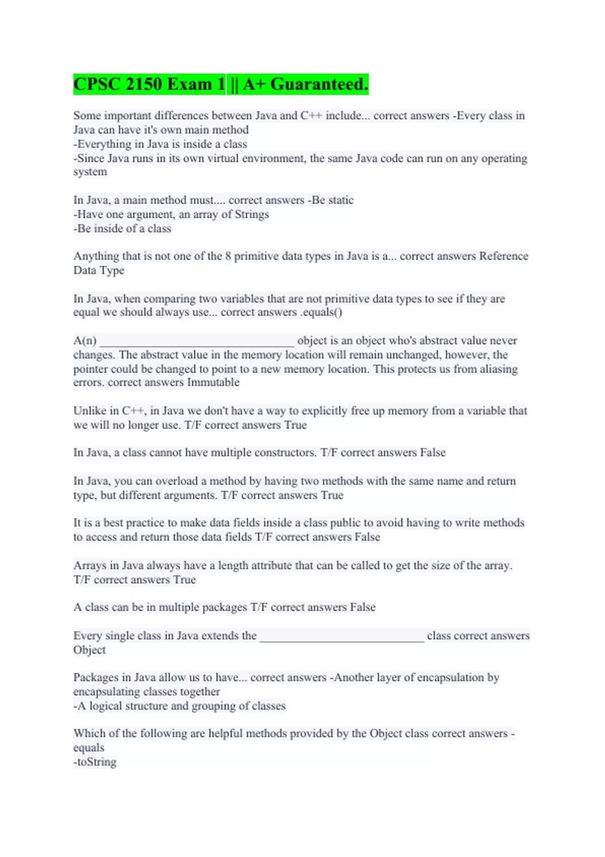 Some important differences between Java and C++ include... correct answers -Every class in Java can have it's own main method -Everything in Java is inside a class -Since Java runs in its own virtual environment, the same Java code can run on any operating system In Java, a main method must.... correct answers -Be static -Have one argument, an array of Strings -Be inside of a class Anything that is not one of the 8 primitive data types in Java is a... correct answers Reference Data Type In Java, when comparing two variables that are not primitive data types to see if they are equal we should always use... correct answers .equals() A(n) ________________________________ object is an object who's abstract value never changes. The abstract value in the memory location will remain unchanged, however, the pointer could be changed to point to a new memory location. This protects us from aliasing errors. correct answers Immutable Unlike in C++, in Java we don't have a way to explicitly free up memory from a variable that we will no longer use. T/F correct answers True In Java, a class cannot have multiple constructors. T/F correct answers False In Java, you can overload a method by having two methods with the same name and return type, but different arguments. T/F correct answers True It is a best practice to make data fields inside a class public to avoid having to write methods to access and return those data fields T/F correct answers False Arrays in Java always have a length attribute that can be called to get the size of the array. T/F correct answers True A class can be in multiple packages T/F correct answers False Every single class in Java extends the ___________________________ class correct answers Object Packages in Java allow us to have... correct answers -Another layer of encapsulation by encapsulating classes together -A logical structure and grouping of classes Which of the following are helpful methods provided by the Object class correct answers -equals -toString