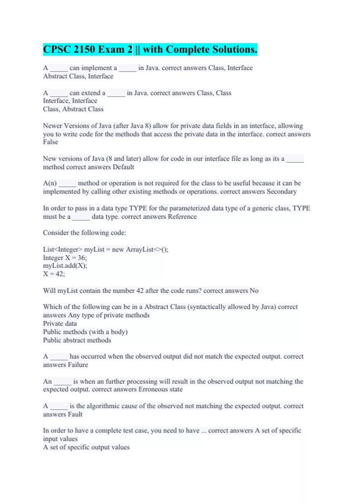 A _____ can implement a _____ in Java. correct answers Class, Interface Abstract Class, Interface A _____ can extend a _____ in Java. correct answers Class, Class Interface, Interface Class, Abstract Class Newer Versions of Java (after Java 8) allow for private data fields in an interface, allowing you to write code for the methods that access the private data in the interface. correct answers False New versions of Java (8 and later) allow for code in our interface file as long as its a _____ method correct answers Default A(n) _____ method or operation is not required for the class to be useful because it can be implemented by calling other existing methods or operations. correct answers Secondary In order to pass in a data type TYPE for the parameterized data type of a generic class, TYPE must be a _____ data type. correct answers Reference Consider the following code: List<Integer> myList = new ArrayList<>(); Integer X = 36; myL(X); X = 42; Will myList contain the number 42 after the code runs? correct answers No Which of the following can be in a Abstract Class (syntactically allowed by Java) correct answers Any type of private methods Private data Public methods (with a body) Public abstract methods A _____ has occurred when the observed output did not match the expected output. correct answers Failure An _____ is when an further processing will result in the observed output not matching the expected output. correct answers Erroneous state A _____ is the algorithmic cause of the observed not matching the expected output. correct answers Fault In order to have a complete test case, you need to have ... correct answers A set of specific input values A set of specific output values