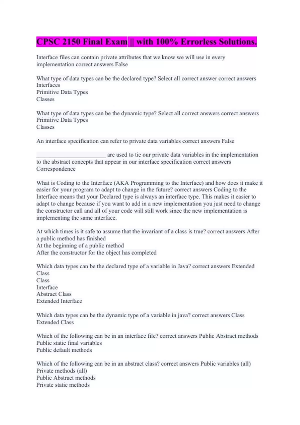 Interface files can contain private attributes that we know we will use in every implementation correct answers False What type of data types can be the declared type? Select all correct answer correct answers Interfaces Primitive Data Types Classes What type of data types can be the dynamic type? Select all correct answers correct answers Primitive Data Types Classes An interface specification can refer to private data variables correct answers False _______________________ are used to tie our private data variables in the implementation to the abstract concepts that appear in our interface specification correct answers Correspondence What is Coding to the Interface (AKA Programming to the Interface) and how does it make it easier for your program to adapt to change in the future? correct answers Coding to the Interface means that your Declared type is always an interface type. This makes it easier to adapt to change because if you want to add in a new implementation you just need to change the constructor call and all of your code will still work since the new implementation is implementing the same interface. At which times is it safe to assume that the invariant of a class is true? correct answers After a public method has finished At the beginning of a public method After the constructor for the object has completed Which data types can be the declared type of a variable in Java? correct answers Extended Class Class Interface Abstract Class Extended Interface Which data types can be the dynamic type of a variable in java? correct answers Class Extended Class Which of the following can be in an interface file? correct answers Public Abstract methods Public static final variables Public default methods Which of the following can be in an abstract class? correct answers Public variables (all) Private methods (all) Public Abstract methods Private static methods