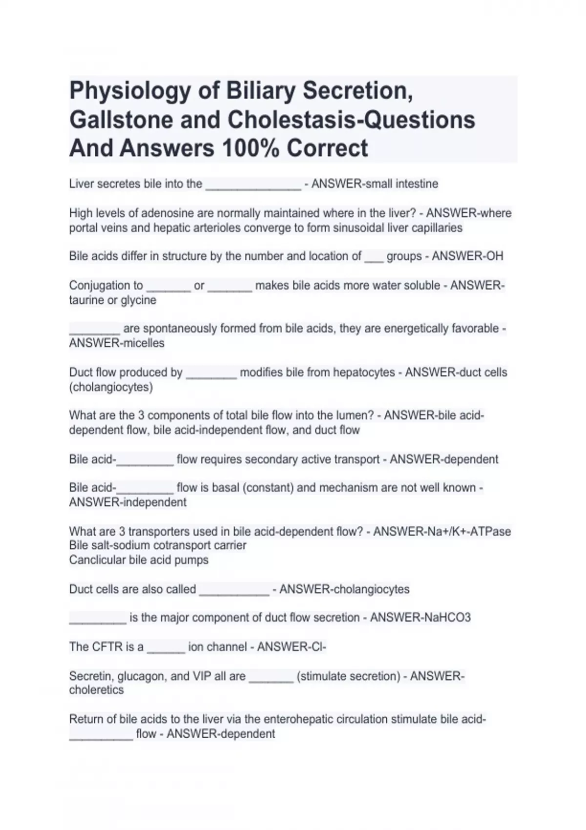 Physiology of Biliary Secretion, Gallstone and Cholestasis-Questions And Answers 100% Correct Liver secretes bile into the _______________ - ANSWER-small intestine High levels of adenosine are normally maintained where in the liver? - ANSWER-where portal veins and hepatic arterioles converge to form sinusoidal liver capillaries Bile acids differ in structure by the number and location of ___ groups - ANSWER-OH Conjugation to _______ or _______ makes bile acids more water soluble - ANSWER-taurine or glycine ________ are spontaneously formed from bile acids, they are energetically favorable - ANSWER-micelles Duct flow produced by ________ modifies bile from hepatocytes - ANSWER-duct cells (cholangiocytes) What are the 3 components of total bile flow into the lumen? - ANSWER-bile acid-dependent flow, bile acid-independent flow, and duct flow Bile acid-_________ flow requires secondary active transport - ANSWER-dependent Bile acid-_________ flow is basal (constant) and mechanism are not well known - ANSWER-independent What are 3 transporters used in bile acid-dependent flow? - ANSWER-Na+/K+-ATPase Bile salt-sodium cotransport carrier Canclicular bile acid pumps Duct cells are also called ___________ - ANSWER-cholangiocytes _________ is the major component of duct flow secretion - ANSWER-NaHCO3 The CFTR is a ______ ion channel - ANSWER-Cl- Secretin, glucagon, and VIP all are _______ (stimulate secretion) - ANSWER-choleretics Return of bile acids to the liver via the enterohepatic circulation stimulate bile acid-__________ flow - ANSWER-dependent