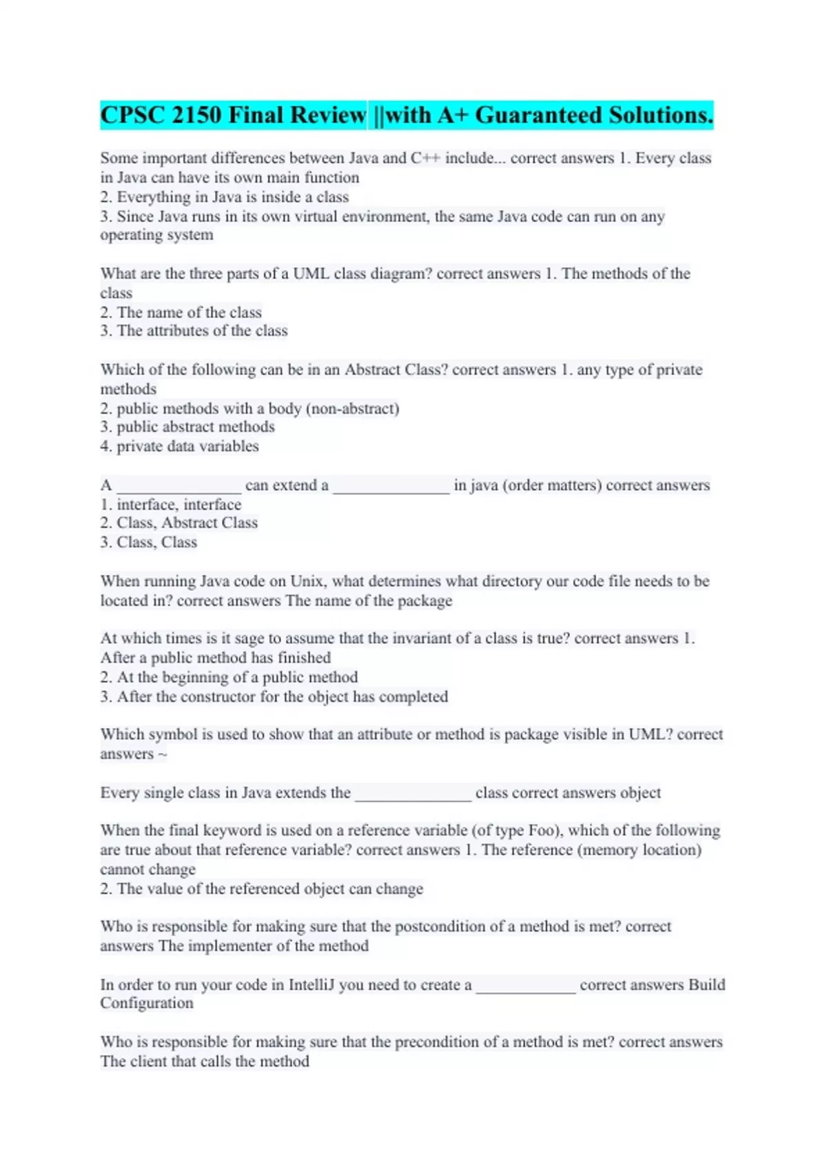 Some important differences between Java and C++ include... correct answers 1. Every class in Java can have its own main function 2. Everything in Java is inside a class 3. Since Java runs in its own virtual environment, the same Java code can run on any operating system What are the three parts of a UML class diagram? correct answers 1. The methods of the class 2. The name of the class 3. The attributes of the class Which of the following can be in an Abstract Class? correct answers 1. any type of private methods 2. public methods with a body (non-abstract) 3. public abstract methods 4. private data variables A _______________ can extend a ______________ in java (order matters) correct answers 1. interface, interface 2. Class, Abstract Class 3. Class, Class When running Java code on Unix, what determines what directory our code file needs to be located in? correct answers The name of the package At which times is it sage to assume that the invariant of a class is true? correct answers 1. After a public method has finished 2. At the beginning of a public method 3. After the constructor for the object has completed Which symbol is used to show that an attribute or method is package visible in UML? correct answers ~ Every single class in Java extends the ______________ class correct answers object When the final keyword is used on a reference variable (of type Foo), which of the following are true about that reference variable? correct answers 1. The reference (memory location) cannot change 2. The value of the referenced object can change Who is responsible for making sure that the postcondition of a method is met? correct answers The implementer of the method In order to run your code in IntelliJ you need to create a ____________ correct answers Build Configuration Who is responsible for making sure that the precondition of a method is met? correct answers The client that calls the method