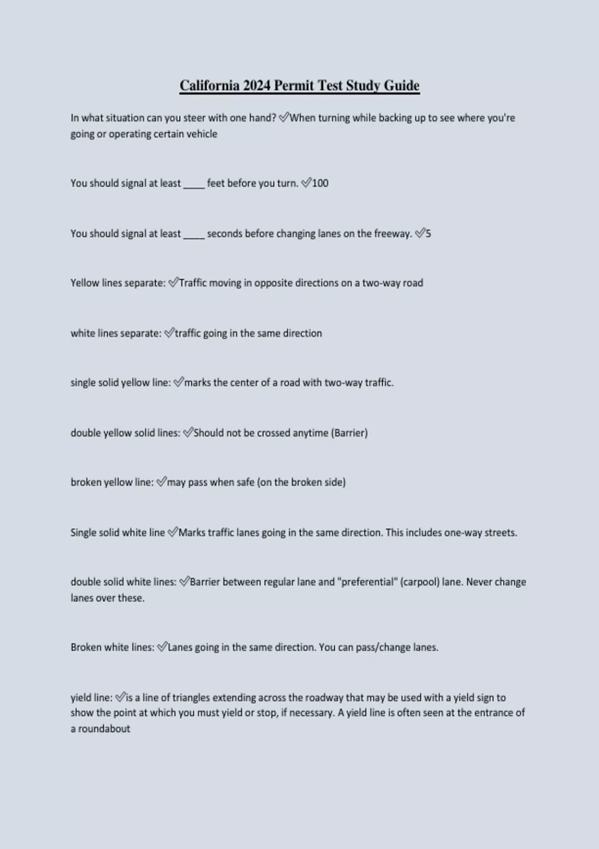 California 2024 Permit Test Study Guide In what situation can you steer with one hand? When turning while backing up to see where you're going or operating certain vehicle You should signal at least ____ feet before you turn. 100 You should signal at least ____ seconds before changing lanes on the freeway. 5 Yellow lines separate: Traffic moving in opposite directions on a two-way road white lines separate: traffic going in the same direction single solid yellow line: marks the center of a road with two-way traffic. double yellow solid lines: Should not be crossed anytime (Barrier) broken yellow line: may pass when safe (on the broken side) Single solid white line Marks traffic lanes going in the same direction. This includes one-way streets. double solid white lines: Barrier between regular lane and "preferential" (carpool) lane. Never change lanes over these. Broken white lines: Lanes going in the same direction. You can pass/change lanes. yield line: is a line of triangles extending across the roadway that may be used with a yield sign to show the point at which you must yield or stop, if necessary. A yield line is often seen at the entrance of a roundabout ending freeway/street lanes marked with: large broken lines which lane is the fast lane? the left lane (number 1) use the left lane to pass or turn left Use the right lane to enter or exit traffic You may only drive for ___ feet in a center left turn lane. 200 You can enter a bike lane to turn within ____ feet of an intersection 200 ft You can make a left turn on red: only at the intersection of two one-way streets and where no sign prohibits it Places you cannot make a U turn In front of a fire station, in business districts You may make a U-turn across a ____ line when it is safe and legal or at an intersection on a green light or green arrow unless a "No U-turn" sign is posted double yellow Don't pass within : 100 ft of an intersection, bridge, tunnel, railroad crossing, or other hazardous place When you parallel park, your vehicle should be within ____inches of the curb 18 If you are parking downhill, you should: Turn your wheels to the right, toward the curb if you're parking uphill... turn your wheels away from the curb If you park on a hill where there is no curb... turn your wheels towards the shoulder the road (away