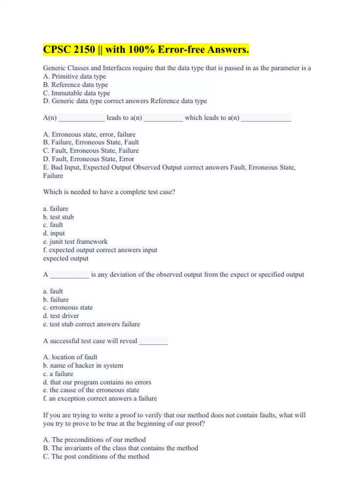 Generic Classes and Interfaces require that the data type that is passed in as the parameter is a A. Primitive data type B. Reference data type C. Immutable data type D. Generic data type correct answers Reference data type A(n) _____________ leads to a(n) ___________ which leads to a(n) ______________ A. Erroneous state, error, failure B. Failure, Erroneous State, Fault C. Fault, Erroneous State, Failure D. Fault, Erroneous State, Error E. Bad Input, Expected Output Observed Output correct answers Fault, Erroneous State, Failure Which is needed to have a complete test case? a. failure b. test stub c. fault d. input e. junit test framework f. expected output correct answers input expected output A ___________ is any deviation of the observed output from the expect or specified output a. fault b. failure c. erroneous state d. test driver e. test stub correct answers failure A successful test case will reveal ________ A. location of fault b. name of hacker in system c. a failure d. that our program contains no errors e. the cause of the erroneous state f. an exception correct answers a failure If you are trying to write a proof to verify that our method does not contain faults, what will you try to prove to be true at the beginning of our proof? A. The preconditions of our method B. The invariants of the class that contains the method C. The post conditions of the method