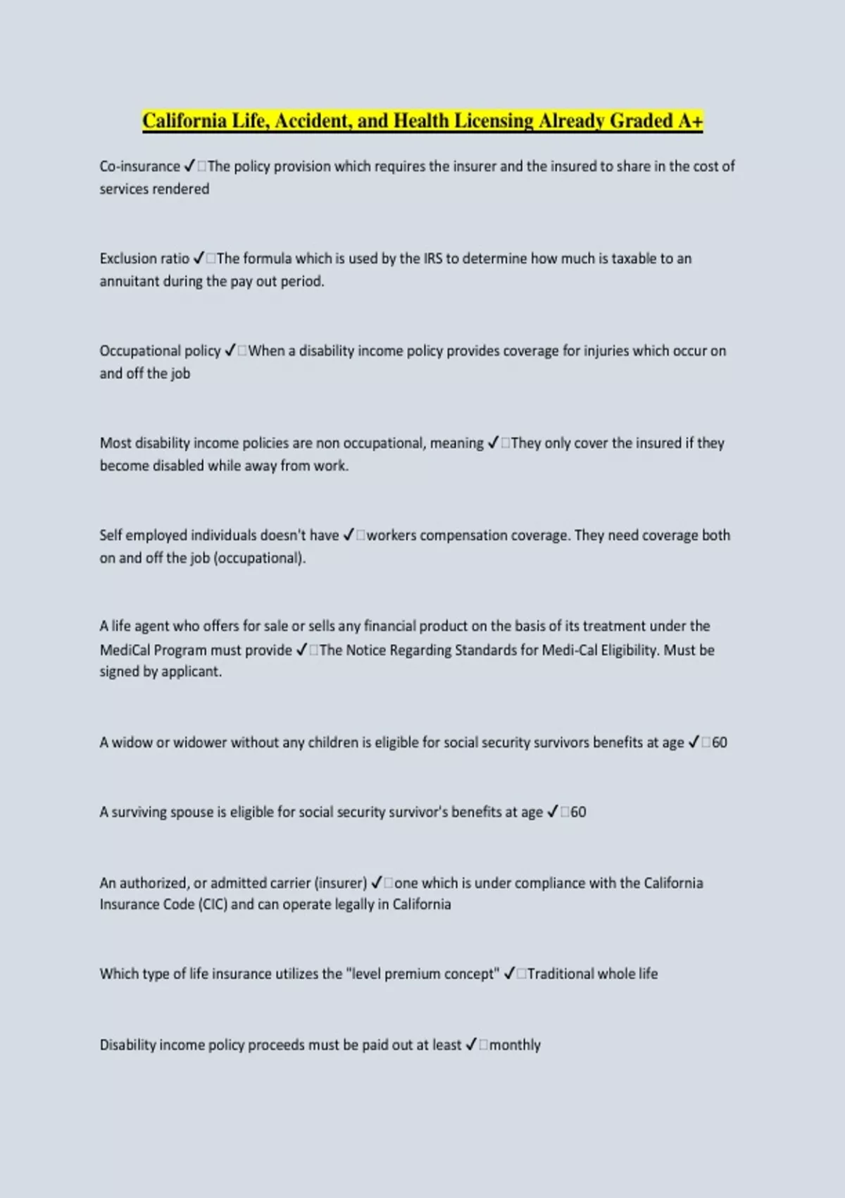 California Life, Accident, and Health Licensing Already Graded A+ Co-insurance ️The policy provision which requires the insurer and the insured to share in the cost of services rendered Exclusion ratio ️The formula which is used by the IRS to determine how much is taxable to an annuitant during the pay out period. Occupational policy ️When a disability income policy provides coverage for injuries which occur on and off the job Most disability income policies are non occupational, meaning ️They only cover the insured if they become disabled while away from work. Self employed individuals doesn't have ️workers compensation coverage. They need coverage both on and off the job (occupational). A life agent who offers for sale or sells any financial product on the basis of its treatment under the MediCal Program must provide ️The Notice Regarding Standards for Medi-Cal Eligibility. Must be signed by applicant. A widow or widower without any children is eligible for social security survivors benefits at age ️60 A surviving spouse is eligible for social security survivor's benefits at age ️60 An authorized, or admitted carrier (insurer) ️one which is under compliance with the California Insurance Code (CIC) and can operate legally in California Which type of life insurance utilizes the "level premium concept" ️Traditional whole life Disability income policy proceeds must be paid out at least ️monthly What life insurance rider will pay a monthly benefit to the insured when they become disabled ️The disability income rider. It is a type of health (disability) insurance Dread (Specified) Disease policies, such as cancer insurance, covers ️Treatment for one specific disease The benefit paid out for a residual disability in a disability income policy is based upon ️a loss of a minimum of 20% of income Agent may be either ️Captive (Exclusive) or independent Captive agents ️agents who agree by contract to represent only one insurer in the sale of insurance Independent agents ️usually self-employed and often represent several insurance companies Under state law, agents must have at least ️one appointment in order to keep their license active Agents are prohibited from engaging in any of the following activities ️1. using a business name that implies that they are an insurer 2. advertising on behalf of a non-admitted insurer 3. offering free insurance as an inducement to purchase or sale Under a group insurance plan a certificate of insurance is issued to ️the participants, usually employees. The policy owner, usually employer, gets the master policy Domestic insurer ️one that domiciled (organized) in this state Foreign insurer ️one that organized in another state Alien insurer ️one that organized in another country. All insurers need to obtain ️a Certificate of Authority from the Commissioner in order to be admitted to transact insurance in this state, except for Surplus Line insurers Indemnity plans allow ️the insured to select any provider they wish. Traditional indemnity plan ️the insured generally is supposed to submit their claims directly to an insurer, in reality an "assignment of benefits" form is utilized and the medical care provider submits the claim on the insured's behalf Participants in a managed care indemnity plan ️select a provider and submits claims to the insurer When an insurer wants to have the applicant complete an HIV test, they must do ️1) Have the applicant sign a consent form 2) Find out which doctor they should provide the results to 3) Provide information on where they can receive counseling When an insurer wants to have the applicant complete an HIV test, they do not need to ️go over a privacy notice 75% of all eligible employees must enroll in a contributory plan. All eligible employees are required to enroll in a ️non contributory plan Loss exposure ️a situation which presents the possibility of loss Deductibles, co-payments and co-insurance are all features of health insurance which are called ️cost sharing Life insurance death benefit policy proceeds paid from an insurer are ️Federal tax free when paid to a beneficiary When an insured with a cash value elects to take the reduced paid-up non-forfeiture option, the cash value will be ️used to buy him a new hole life policy with a reduced face amount that is paid-up for life The traditional net cost method of evaluating the true cost of insurance does not take into consideration ️the time value of money The primary difference between using the interest adjusted net cost method and the net cost method when evaluating the true cost of a life insurance policy ️time value of money Dividends may never be ️guaranteed All are true about "stock" insurance companies ️1) Dividends are taxable 2) The stockholders own the company 3) They may pay dividends to share holders out of divisible surplus 4) they issue non-participating policies Under the Family and Medical Leave Act, how many weeks of leave must be provided per year for a qualifying person ️12 weeks ESOP invest in ️Stock of the employer Riders may be added to a policy at issue for an additional premium charge. Examples of riders ️1) accidental Death benefit 2) Cost of living 3) Waiver of Premium as used in the CIC the word "shall" is mandatory and the word "may" is ️permissive