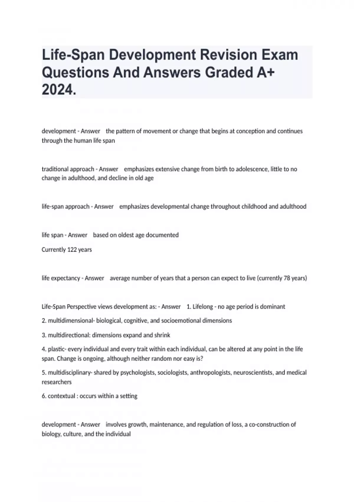 Life-Span Development Revision Exam Questions And Answers Graded A+ 2024.