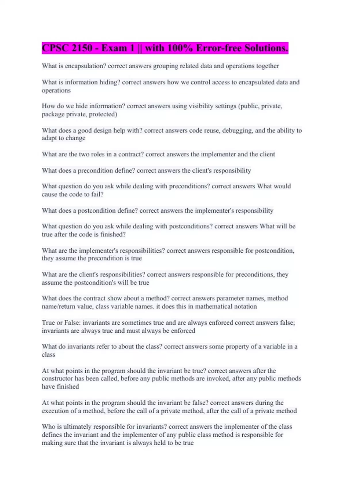 What is encapsulation? correct answers grouping related data and operations together What is information hiding? correct answers how we control access to encapsulated data and operations How do we hide information? correct answers using visibility settings (public, private, package private, protected) What does a good design help with? correct answers code reuse, debugging, and the ability to adapt to change What are the two roles in a contract? correct answers the implementer and the client What does a precondition define? correct answers the client's responsibility What question do you ask while dealing with preconditions? correct answers What would cause the code to fail? What does a postcondition define? correct answers the implementer's responsibility What question do you ask while dealing with postconditions? correct answers What will be true after the code is finished? What are the implementer's responsibilities? correct answers responsible for postcondition, they assume the precondition is true What are the client's responsibilities? correct answers responsible for preconditions, they assume the postcondition's will be true What does the contract show about a method? correct answers parameter names, method name/return value, class variable names. it does this in mathematical notation True or False: invariants are sometimes true and are always enforced correct answers false; invariants are always true and must always be enforced What do invariants refer to about the class? correct answers some property of a variable in a class At what points in the program should the invariant be true? correct answers after the constructor has been called, before any public methods are invoked, after any public methods have finished At what points in the program should the invariant be false? correct answers during the execution of a method, before the call of a private method, after the call of a private method Who is ultimately responsible for invariants? correct answers the implementer of the class defines the invariant and the implementer of any public class method is responsible for making sure that the invariant is always held to be true
