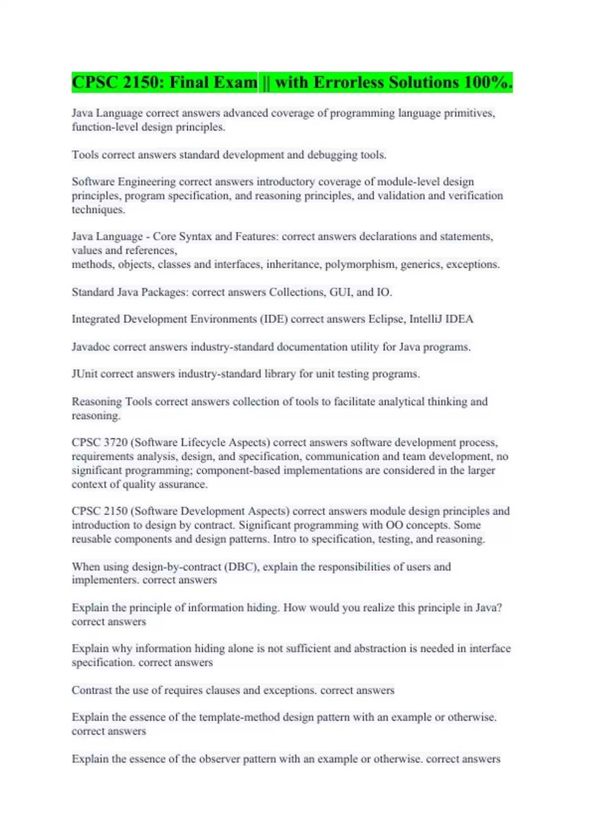 Java Language correct answers advanced coverage of programming language primitives, function-level design principles. Tools correct answers standard development and debugging tools. Software Engineering correct answers introductory coverage of module-level design principles, program specification, and reasoning principles, and validation and verification techniques. Java Language - Core Syntax and Features: correct answers declarations and statements, values and references, methods, objects, classes and interfaces, inheritance, polymorphism, generics, exceptions. Standard Java Packages: correct answers Collections, GUI, and IO. Integrated Development Environments (IDE) correct answers Eclipse, IntelliJ IDEA Javadoc correct answers industry-standard documentation utility for Java programs. JUnit correct answers industry-standard library for unit testing programs. Reasoning Tools correct answers collection of tools to facilitate analytical thinking and reasoning. CPSC 3720 (Software Lifecycle Aspects) correct answers software development process, requirements analysis, design, and specification, communication and team development, no significant programming; component-based implementations are considered in the larger context of quality assurance. CPSC 2150 (Software Development Aspects) correct answers module design principles and introduction to design by contract. Significant programming with OO concepts. Some reusable components and design patterns. Intro to specification, testing, and reasoning. When using design-by-contract (DBC), explain the responsibilities of users and implementers. correct answers Explain the principle of information hiding. How would you realize this principle in Java? correct answers Explain why information hiding alone is not sufficient and abstraction is needed in interface specification. correct answers Contrast the use of requires clauses and exceptions. correct answers Explain the essence of the template-method design pattern with an example or otherwise. correct answers Explain the essence of the observer pattern with an example or otherwise. correct answers