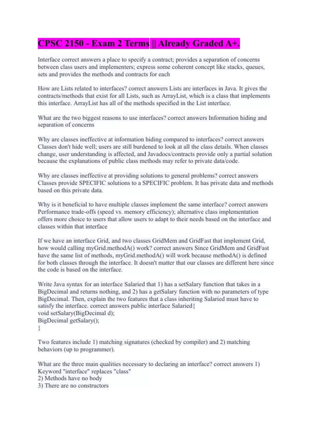 Interface correct answers a place to specify a contract; provides a separation of concerns between class users and implementers; express some coherent concept like stacks, queues, sets and provides the methods and contracts for each How are Lists related to interfaces? correct answers Lists are interfaces in Java. It gives the contracts/methods that exist for all Lists, such as ArrayList, which is a class that implements this interface. ArrayList has all of the methods specified in the List interface. What are the two biggest reasons to use interfaces? correct answers Information hiding and separation of concerns Why are classes ineffective at information hiding compared to interfaces? correct answers Classes don't hide well; users are still burdened to look at all the class details. When classes change, user understanding is affected, and Javadocs/contracts provide only a partial solution because the explanations of public class methods may refer to private data/code. Why are classes ineffective at providing solutions to general problems? correct answers Classes provide SPECIFIC solutions to a SPECIFIC problem. It has private data and methods based on this private data. Why is it beneficial to have multiple classes implement the same interface? correct answers Performance trade-offs (speed vs. memory efficiency); alternative class implementation offers more choice to users that allow users to adapt to their needs based on the interface and classes within that interface If we have an interface Grid, and two classes GridMem and GridFast that implement Grid, how would calling myGdA() work? correct answers Since GridMem and GridFast have the same list of methods, myGdA() will work because methodA() is defined for both classes through the interface. It doesn't matter that our classes are different here since the code is based on the interface. Write Java syntax for an interface Salaried that 1) has a setSalary function that takes in a BigDecimal and returns nothing, and 2) has a getSalary function with no parameters of type BigDecimal. Then, explain the two features that a class inheriting Salaried must have to satisfy the interface. correct answers public interface Salaried{ void setSalary(BigDecimal d); BigDecimal getSalary(); } Two features include 1) matching signatures (checked by compiler) and 2) matching behaviors (up to programmer). What are the three main qualities necessary to declaring an interface? correct answers 1) Keyword "interface" replaces "class" 2) Methods have no body 3) There are no constructors