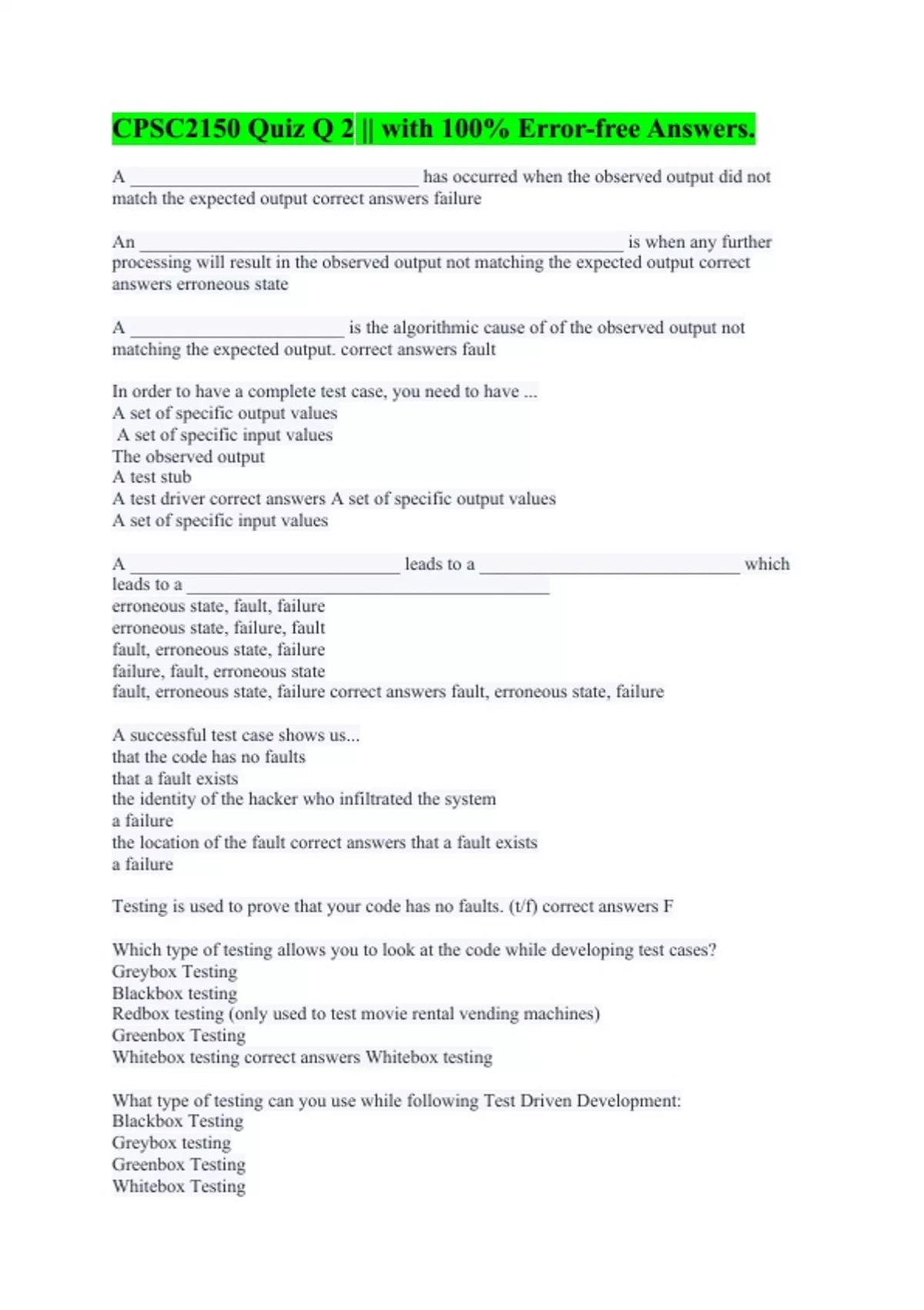 A _______________________________ has occurred when the observed output did not match the expected output correct answers failure An ____________________________________________________ is when any further processing will result in the observed output not matching the expected output correct answers erroneous state A _______________________ is the algorithmic cause of of the observed output not matching the expected output. correct answers fault In order to have a complete test case, you need to have ... A set of specific output values A set of specific input values The observed output A test stub A test driver correct answers A set of specific output values A set of specific input values A _____________________________ leads to a ____________________________ which leads to a _______________________________________ erroneous state, fault, failure erroneous state, failure, fault fault, erroneous state, failure failure, fault, erroneous state fault, erroneous state, failure correct answers fault, erroneous state, failure A successful test case shows us... that the code has no faults that a fault exists the identity of the hacker who infiltrated the system a failure the location of the fault correct answers that a fault exists a failure Testing is used to prove that your code has no faults. (t/f) correct answers F Which type of testing allows you to look at the code while developing test cases? Greybox Testing Blackbox testing Redbox testing (only used to test movie rental vending machines) Greenbox Testing Whitebox testing correct answers Whitebox testing What type of testing can you use while following Test Driven Development: Blackbox Testing Greybox testing Greenbox Testing Whitebox Testing